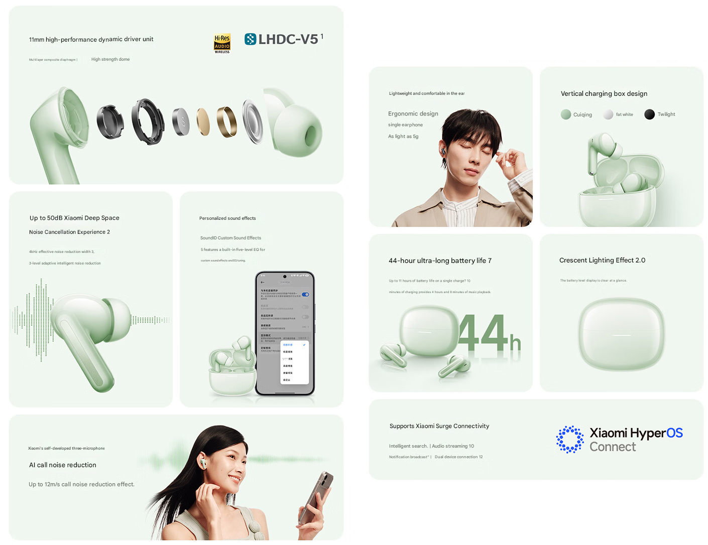 Beim Sound setzt Xiaomi laut eigenen Angaben auf einen 11-mm-Dynamiktreiber mit einer „mehrschichtigen Verbundmembran“. Unterstützt wird zudem LHDC V5, wodurch die Earbuds die Hi-Res-Audio-Wireless-Zertifizierung erreichen. Dabei ist allerdings zu beachten, dass dieser Codec hauptsächlich von chinesischen Smartphones unterstützt wird.