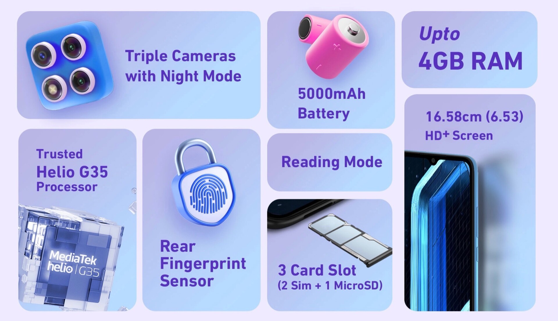 Im Inneren arbeitet ein MediaTek Helio G35, ein Einsteiger-SoC aus dem Vorjahr, der acht ARM Cortex-A53-Rechenkerne bei Taktfrequenzen von bis zu 2,3 GHz bietet. Das Smartphone kommt mit 3 GB bis 4 GB Arbeitsspeicher und mit 32 GB bis 64 GB Flash-Speicher, der über eine microSD-Speicherkarte erweitert werden kann. Xiaomi verbaut einen 5.000 mAh fassenden Akku, das Unternehmen hat bisher allerdings nicht angegeben, ob dieser über USB-C oder über Micro-USB geladen wird.