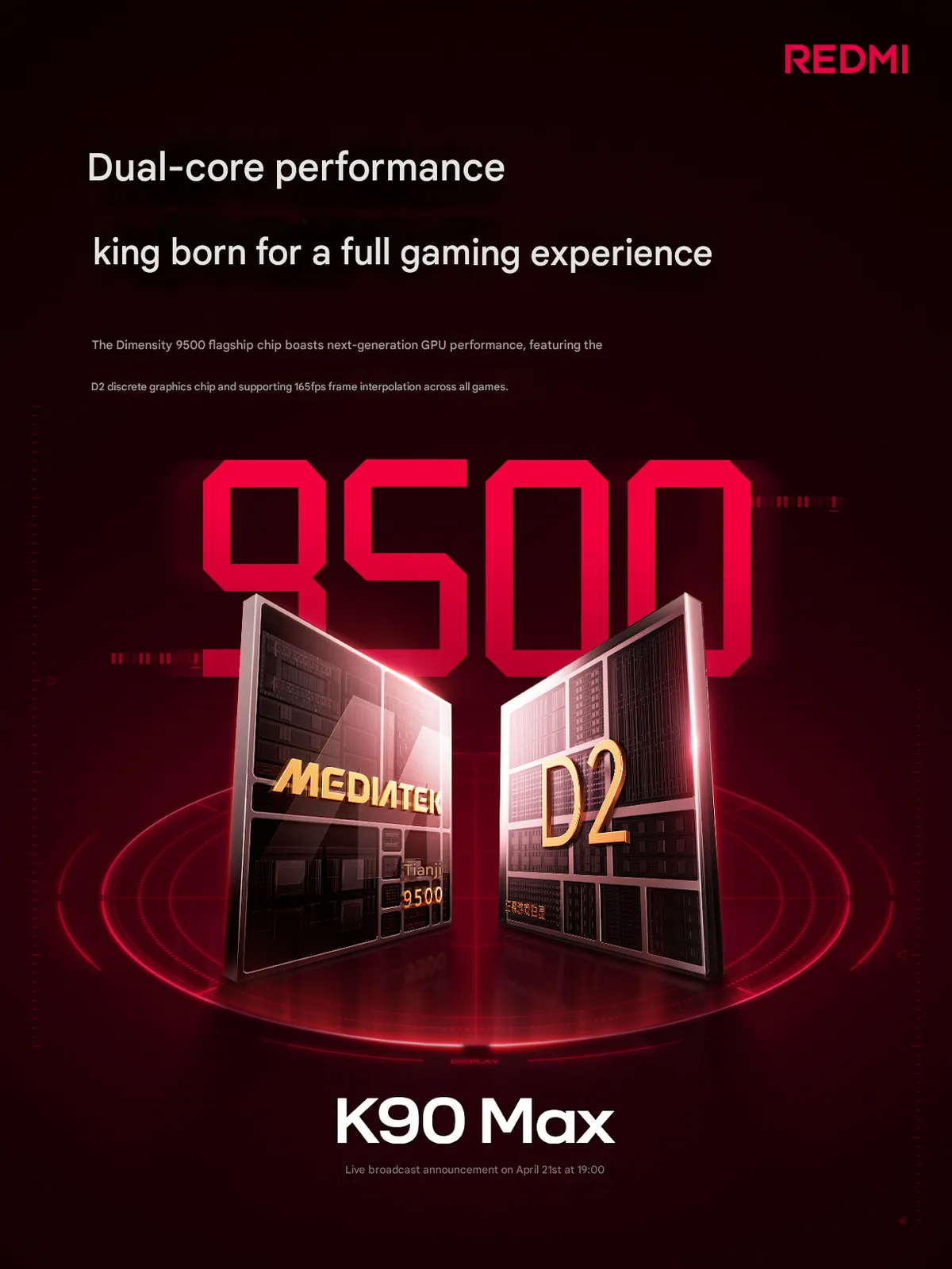 Wie Xiaomi bestätigt hat, wird das Redmi K90 Max vom Dimensity 9500 angetrieben, dem aktuellen Flaggschiff-SoC von MediaTek. Unterstützt wird dieser durch den dedizierten D2-Grafikchip. In Kombination mit einem aktiven Kühlsystem verspricht dieses Setup ein „Gaming-Erlebnis auf Top-Niveau“.