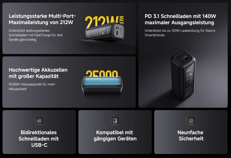 Der erste USB-Anschluss liefert über das PD-3.1-Ladeprotokoll bis zu 140 W und kann somit auch Laptops und Co schnell laden. Über den USB-C2-Ausgang stehen bis zu 45 W parat. Für den einen USB-A-Port nennt Xiaomi eine maximale Leistung von 120 W. Hierfür muss allerdings ein Xiaomi 6A Type-C Fast Charging Cable verwendet werden. Für Smartwatches, Ohrhörer und Co gibt es auch einen Niedrigstrom-Entlademodus.