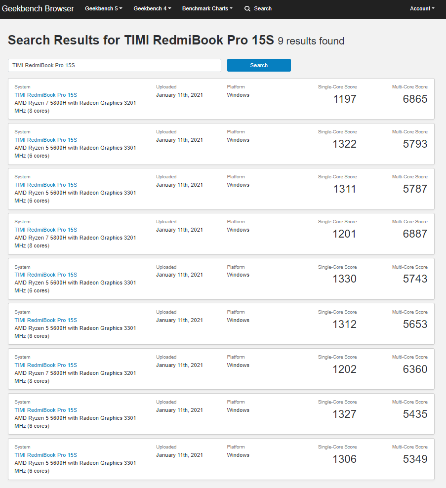 Die Benchmark-Datenbank liefert aber auch diverse Einträge zu einem RedmiBook Pro 15S (TIMI TM2019), das wahlweise mit einem AMD Ryzen 5 5600H oder einem Ryzen 7 5800H sowie mit 8 GB bis 16 GB RAM ausgestattet ist. Den Benchmark-Ergebnissen zufolge dürfte die Intel-Version eine bessere Single-Core-Performance bieten, während AMD Ryzen 5000 durch die doppelte Anzahl an Kernen bei Multi-Core-Anwendungen klar die Nase vorn hat.