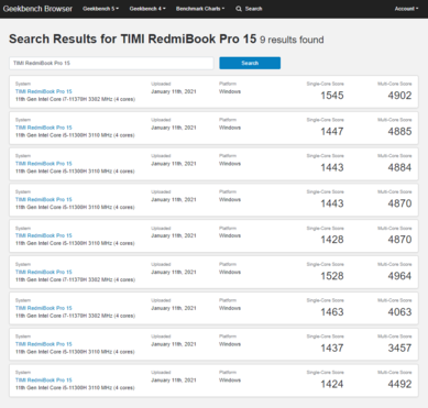 Während Xiaomi selbst bislang keine weiteren Features verraten wollte gibts auf Geekbench bereits diverse Einträge, die Aufschluss über die zu erwartende Ausstattung geben. Demnach werden Modelle mit einem Intel Core i5-11300H sowie mit einem Core i7-11370H angeboten, die mit 16 GB Arbeitsspeicher ausgestattet sind. Dieses RedmiBook Pro 15 wird bei Geekbench unter der Modellnummer TIMI TM2017 geführt.
