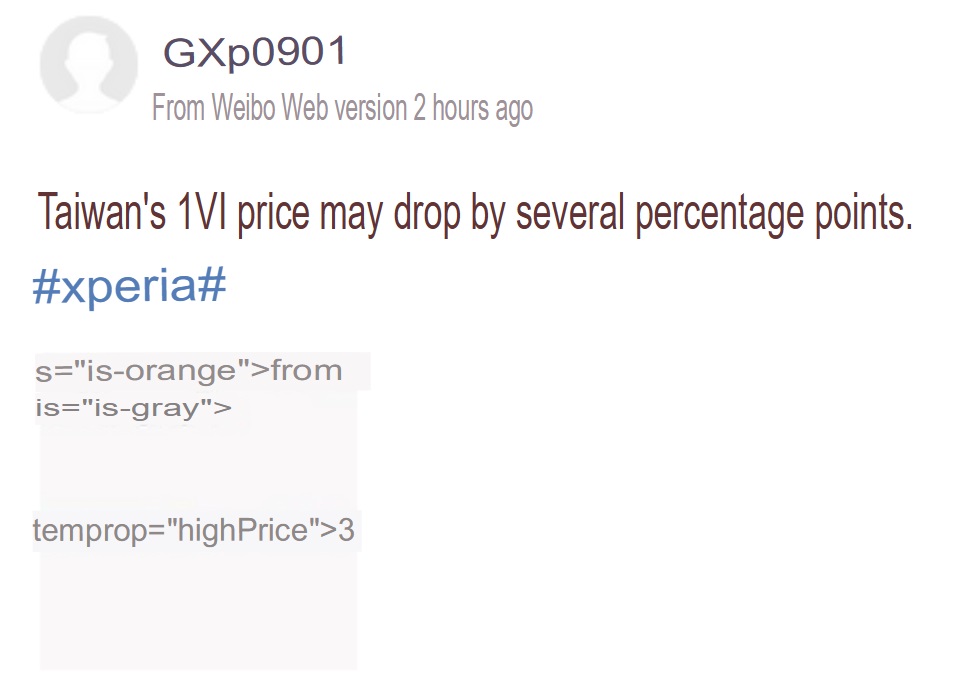 Ein im Sony-Umfeld bekannter Leaker aus dem chinesischen Netzwerk Weibo, dessen Posts allerdings immer wieder gelöscht werden, hat kürzlich den Screenshot aus dem Sourcecode einer Webseite veröffentlicht (siehe unten), der den Xperia 1 VI Preis in taiwanesischen Dollar zeigen soll. Das wird zumindest von der japanischen Sony-Fanseite Sumahodigest behauptet, zweifelsfrei verifiziert ist das nicht. Sollte die Annahme stimmen, dann sinkt der Preis des vermutlich am 17. Mai 2024 offiziell startenden Xperia-Flaggschiffs von bisher 41.990 TWD in Taiwan auf 39.900 TWD, eine Reduktion um 4,76 Prozent, was natürlich auch an Wechselkursschwankungen liegen kann.
