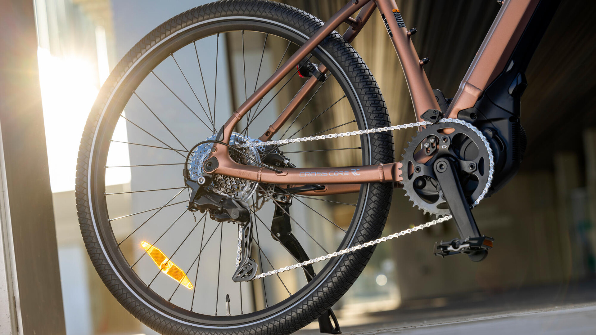 Das Gewicht des E-Bikes liegt in Abhängigkeit von der gewählten Größenversion bei zwischen 23,5 und 23,7 Kilogramm, was für ein E-Bike einen nicht zu hohen Wert darstellt. Verbaut ist eine SR Suntour NEX-E25-C-Federgabel. Die hydraulischen Scheibenbremsen stammen von Shimano, die BR-MT200-Bremsen verzögern vorne eine 180 Millimeter große Bremsscheibe und hinten eine 160-Millimeter-Scheibe. Aufgezogen sind 2 Zoll breite und unabhängig von der Modellversion 27,5 Zoll große Reifen. Es ist eine Cues-Kettenschaltung von Shimano mit neun Gängen verbaut. Das Crosscore RC ist noch nicht erhältlich und soll in zwei Farbversionen und drei Größen auf den Markt kommen.