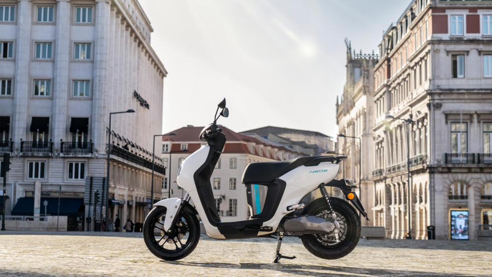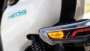 So sind beispielsweise die beiden LED-Scheinwerfer des Yamaha Neos von weißen Einfassungen eingerahmt, die dem eRoller ein eigenständiges und markantes Gesicht verleihen. Dicke Gummileisten an den Konturen der Verkleidung sollen den Neos-Elektroroller wirkungsvoll vor Beschädigungen im urbanen Großstadtdschungel als vollelektrisches Pendlerfahrzeug schützen. Angeboten wird der Yamaha Neo's in zwei Farben: Milky White und Midnight Black. Beide Farbvarianten des Neo's verziert eine blaufarbene Akzentfarbe auf der Batterieabdeckung (Yamaha) und das Neos-Logo.
