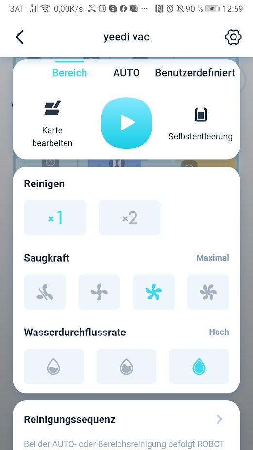Die Yeedi App unterscheidet sich kaum von den Steuerungs-Apps der Konkurrenz. Auch hier findet man Steuerungsmöglichkeiten zur Saugleistung, zur Wassernutzung, wie viele Reinigungsdurchgänge gefahren werden sollen und wo der Roboter reinigen soll. Alle Menüpunkte sind gut erreichbar und verständlich beschriftet. Weder in der deutschen noch in der englischen Übersetzung der App fallen uns hier Probleme auf.