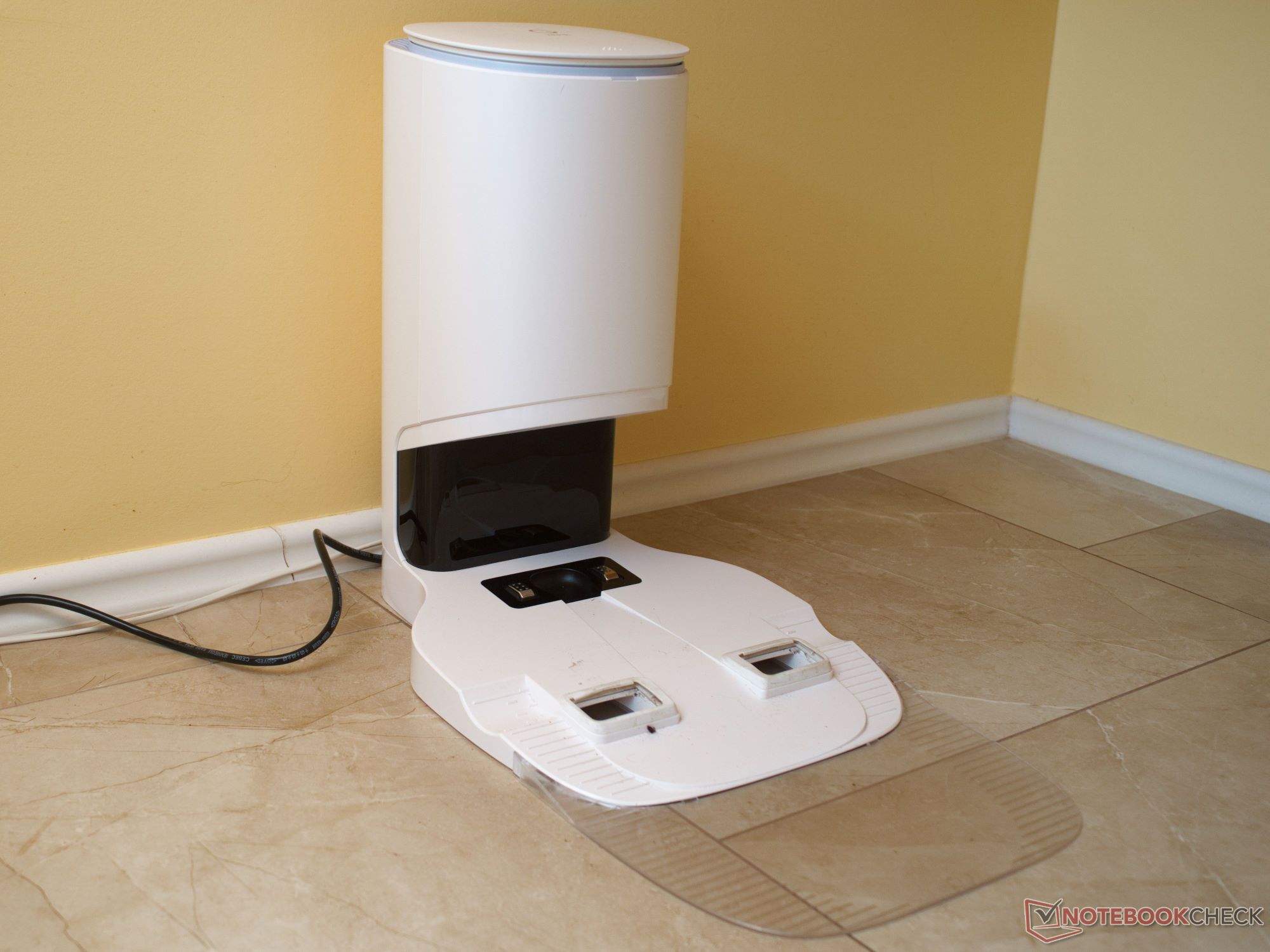 Die Selbstentleerungsstation des Yeedi ist ebenfalls größtenteils weiß. Ein kleiner hellblauer Rand lockert hier etwas auf. Um den Fußboden zu schonen, liegt hier zudem eine transparente Platte bei, über der sich das Wischsystem des Roboters befinden, sobald er an der Station lädt.