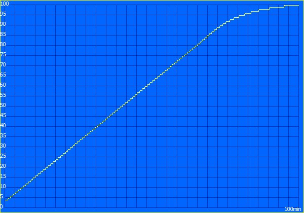 Der Akku ist recht schnell wieder aufgeladen, denn für 100 % benötigt das Gerät im eingeschalteten Zustand 100 Minuten. Davor ist die Ladekurve stabil und 80 % der Kapazität stehen nach etwas mehr als einer Stunde wieder zur Verfügung.