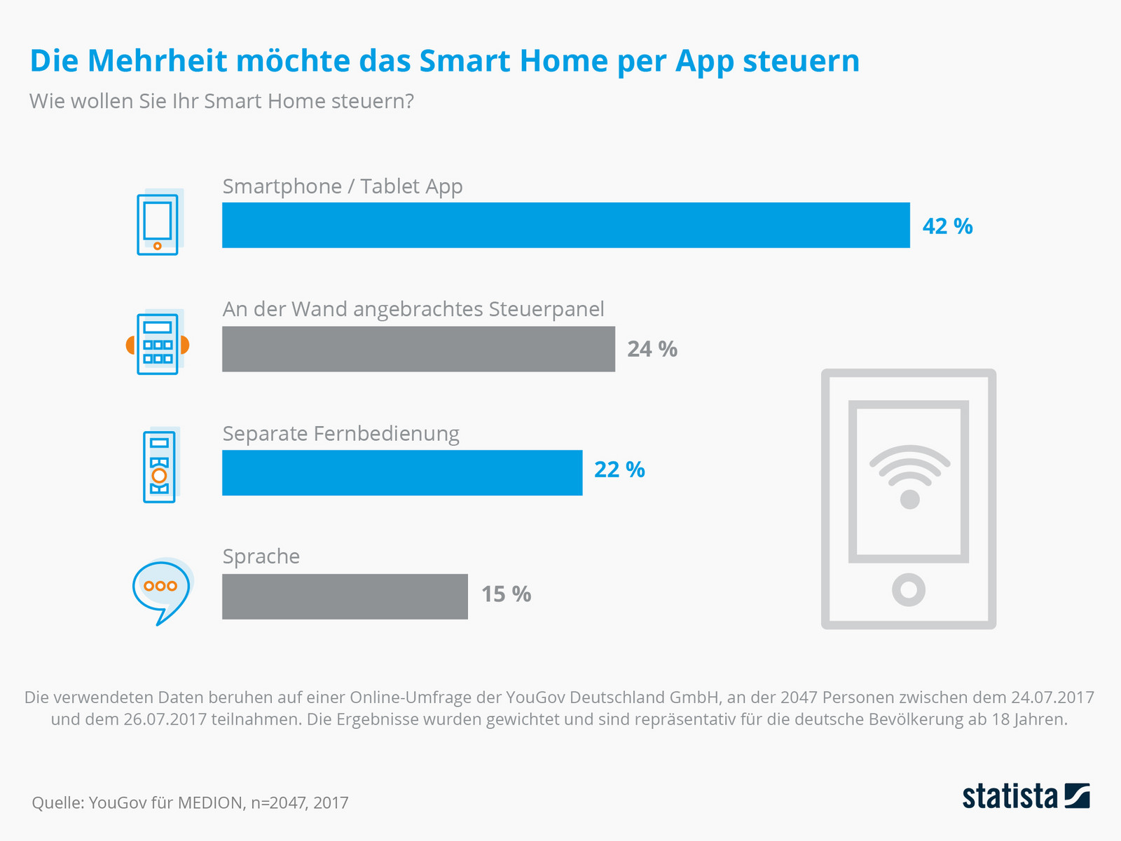 Als Verbindungs- bzw. Kommunikationsstandard ihres Smart Home Systems bevorzugen die Deutschen die bereits am Markt etablierten Standards WLAN (18 Prozent) und Bluetooth (7 Prozent). Gesteuert wird das Smart Home am liebsten per Apps für Smartphone und Tablet (42 Prozent). Die Bedienung per Sprache wird, obwohl sie erst seit wenigen Jahren in der Konsumelektronik eingesetzt wird, bereits von 15 Prozent gewünscht.