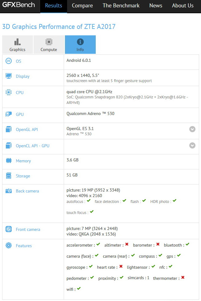 Dafür macht die Tenaa Angaben zu Speicher und Betriebssystem (OS). Demnach verfügt das Axon 2 in spe über 4 GB Arbeitsspeicher (RAM) und 64 GB Systemmemory, der sich um bis zu 128 GB erweitern lässt. Als Mobile-OS ist Googles Android 6.0.1 Marshmallow auf dem ZTE-Smartphone installiert. Als Kameras werden eine 20-MP-Hauptkamera an der Rückseite sowie eine Selfiekamera vorne mit 8 MP genannt. Über die Suche des Benchmarks GFXBench findet sich ebenfalls das ZTE A2017. Dort werden die technischen Informationen aus dem Tenaa-Listing bestätigt.