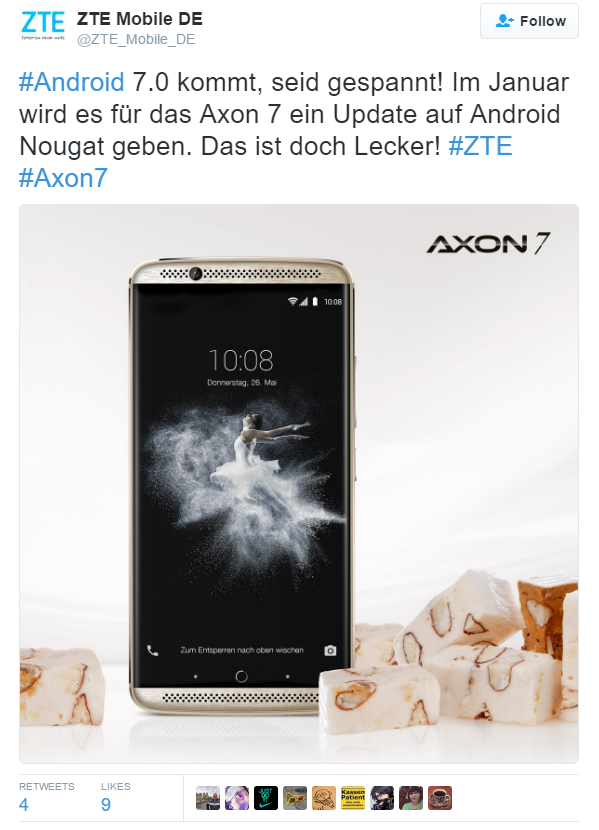 Ein Tweet auf der deutschen Twitterseite von ZTE bestätigt, dass der Hersteller an einem Android 7-Update für das populäre und auch hierzulande offiziell erhältliche Axon 7 arbeitet und es im Jänner als Update für alle Axon 7-Besitzer verteilen wird. Ein Bild sieht das Axon 7 schon inmitten von Nougat-Stückchen doch was einige VR-Fans von ZTE lieber hätten als süßes Konfekt ist Google Daydream-Kompatibilität. Die wurde nämlich für das Axon 7 rückwirkend in Aussicht gestellt.