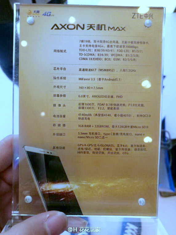 Bei der Ausstattung nennt ZTE für sein Axon Max neben einem Full-HD-Display (AMOLED) mit 1920 x 1080 Pixeln einen Qualcomm Snapdragon 617 MSM8952 8-Kern-Prozessor, 3 GB RAM und 32 GB Systemspeicher, der sich via microSD-Speicherkarten optional um bis zu 128 GB erweitern lässt. Dual SIM, LTE, 2 Kameras (16 MP hinten, 13 MP vorne) und ein 4140-mAh-Akku runden die Ausstattung des Axon Max ab. Als Mobile-OS läuft Android 5.1 mit MiFavor 3.5 UI.