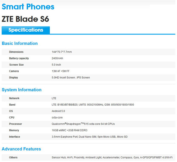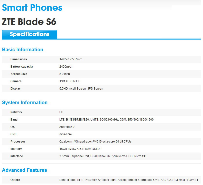 Befeuert wird das 144 x 70,7 x 7,7 Millimeter messende Blade S6 von einem 64 Bit Qualcomm Snapdragon 615 MSM8939 Octacore-Prozessor inklusive Adreno 405 GPU, sowie 2 GByte Arbeitsspeicher und 16 GByte eMMC. Als Mobile OS läuft auf dem Blade S6 das neueste Android-Betriebssystem von Google: Android 5.0 Lollipop. Obendrauf gibt es als Nutzeroberfläche (UI) ZTEs eigenes Mifavor UI 3.0.