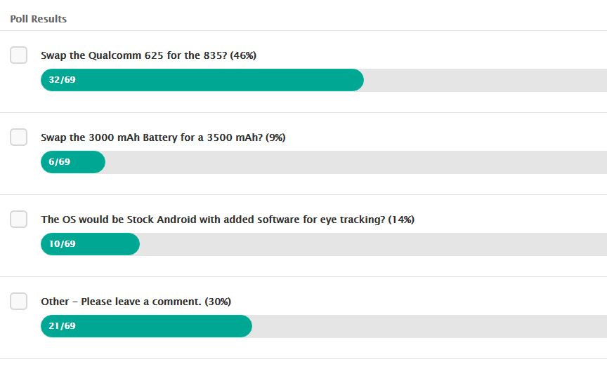 Zur Auswahl, siehe unten, stehen ein Snapdragon 835-SOC statt des Midrange-Prozessors Snapdragon 625, eine stärkere Batterie, ein Stock-Android mit Eye-Tracking-Komponenten sowie eine freie Position für andere Ideen. Der Hersteller schränkt jedoch gleich ein: Mehr als ein bis zwei Komponenten könnten nicht geändert werden ohne den Preis erhöhen zu müssen, aus dem Midrange-Phone wird also kein Flaggschiff-Produkt mehr werden. In den Kommentaren werden etwa mehr RAM, mehr LTE-Bänder und Stereo-Lautsprecher gefordert. Auch ein anderes Display mit höherer Auflösung oder eine bessere Kamera werden als Wünsche erwähnt. Fraglich ist, ob sich durch ein oder zwei Änderungen bei den Spezifikationen noch deutlich mehr Unterstützer finden werden. Wer an dem Projekt interessiert ist, kann jetzt jedenfalls dabei mitwirken, das Gerät noch zu verbessern.
