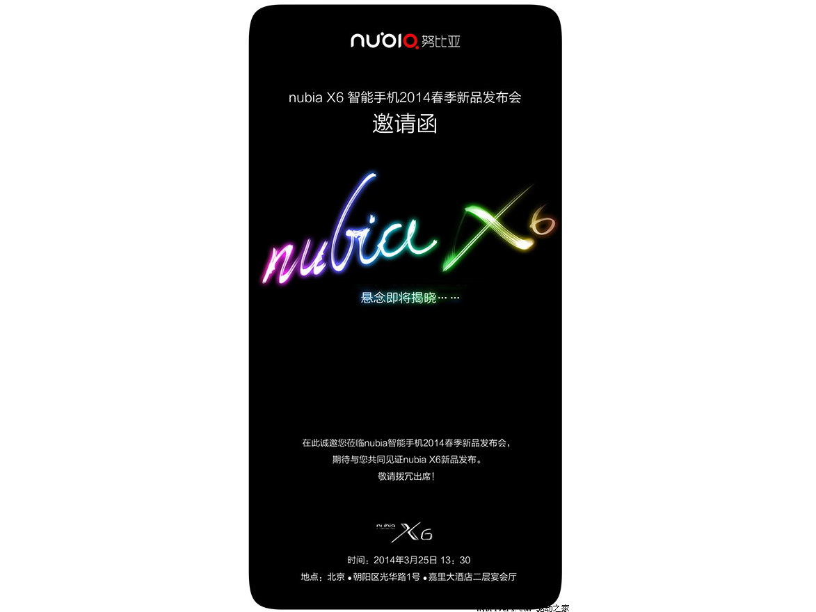Das Nubia X6 soll der nächste große Wurf von ZTE bei den High-End-Smartphones werden. Laut den bisher kursierenden Gerüchten und Informationen kann das auch glatt etwas werden. Ende vergangener Woche versandte ZTE die Einladung zur Weltpremiere für sein brandneues Smartphone-Flaggschiff Nubia X6: 25. März, Peking. Genau an dem Tag also, an dem auch HTC sein neues HTC One M8 vorstellen wird.