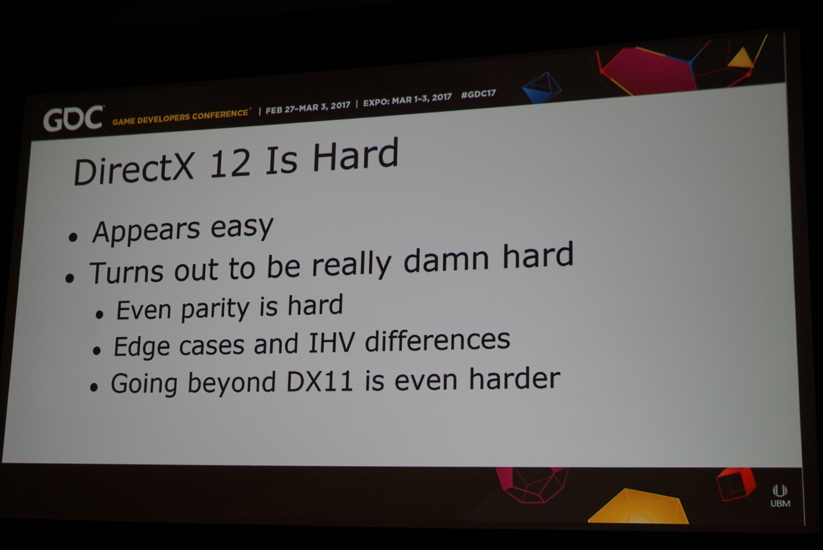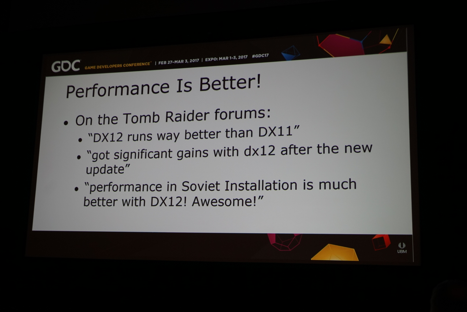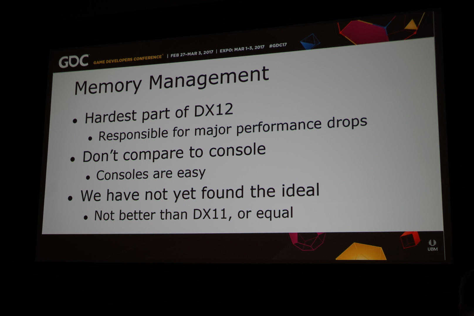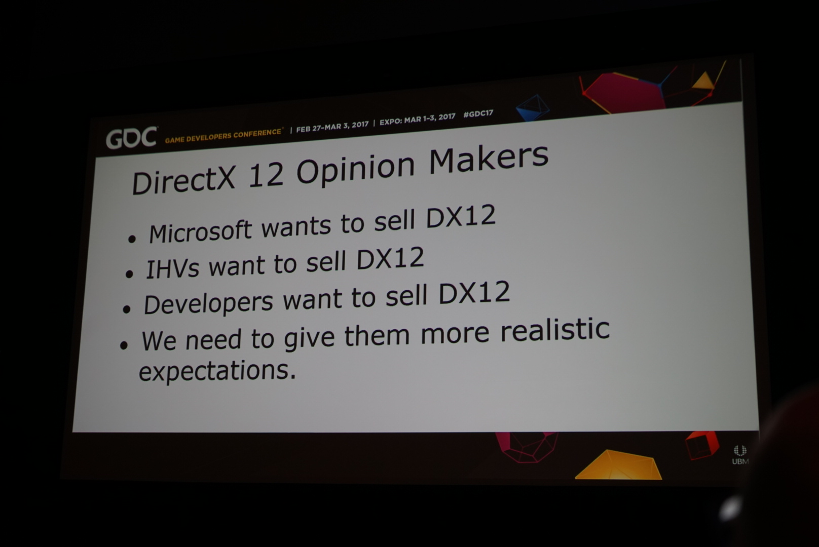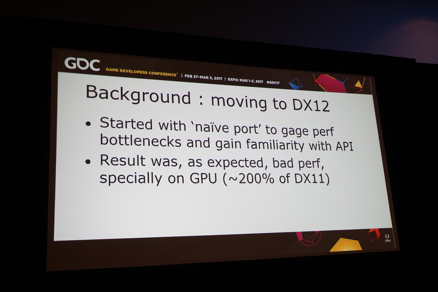 Auch ein Entwickler von Ubisoft (für die Assassins Creed Spiele) machte eine ähnliche Erfahrung und meinte in einem späteren Talk das ein direkter Port auf DirectX 12 ohne Optimierungen zu einer deutlich verringerten Performance führte (200% laut Folie).