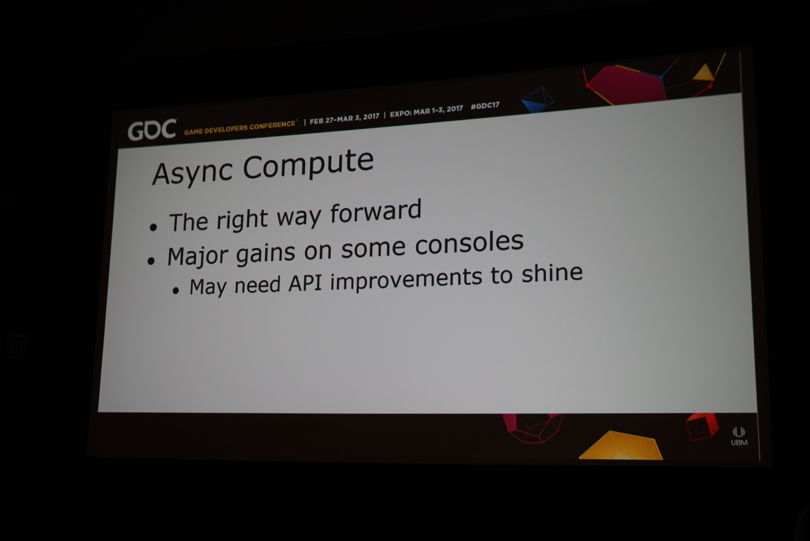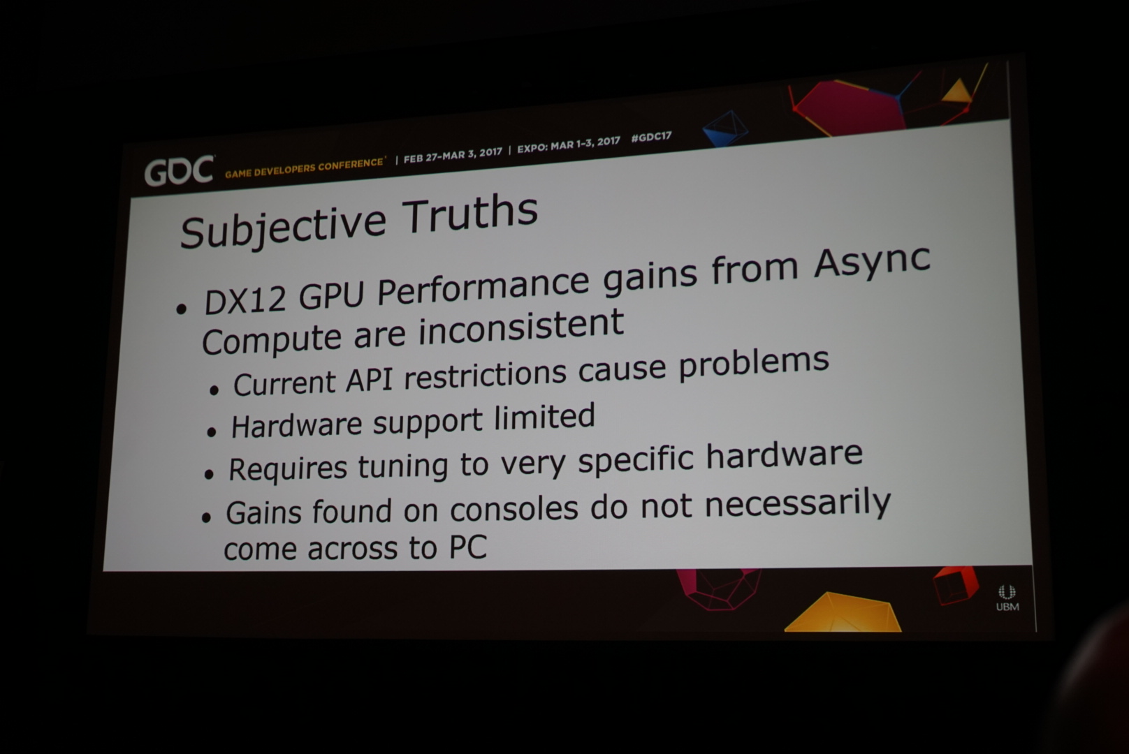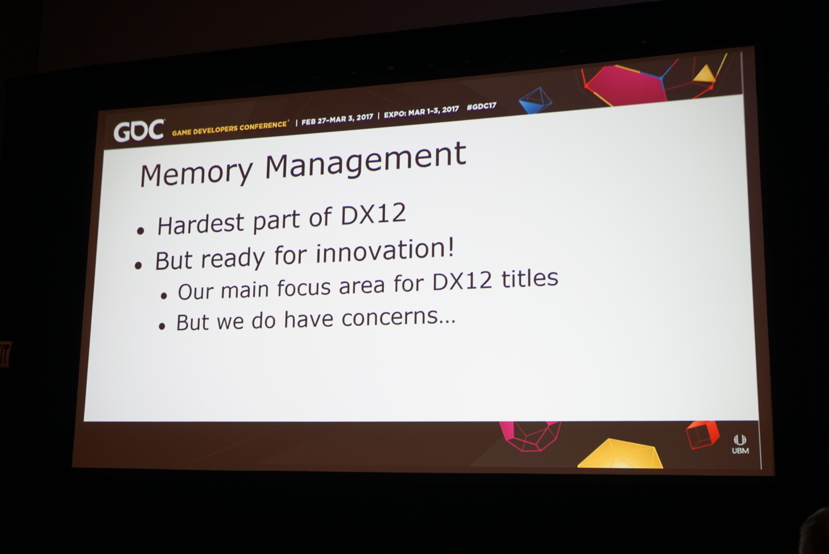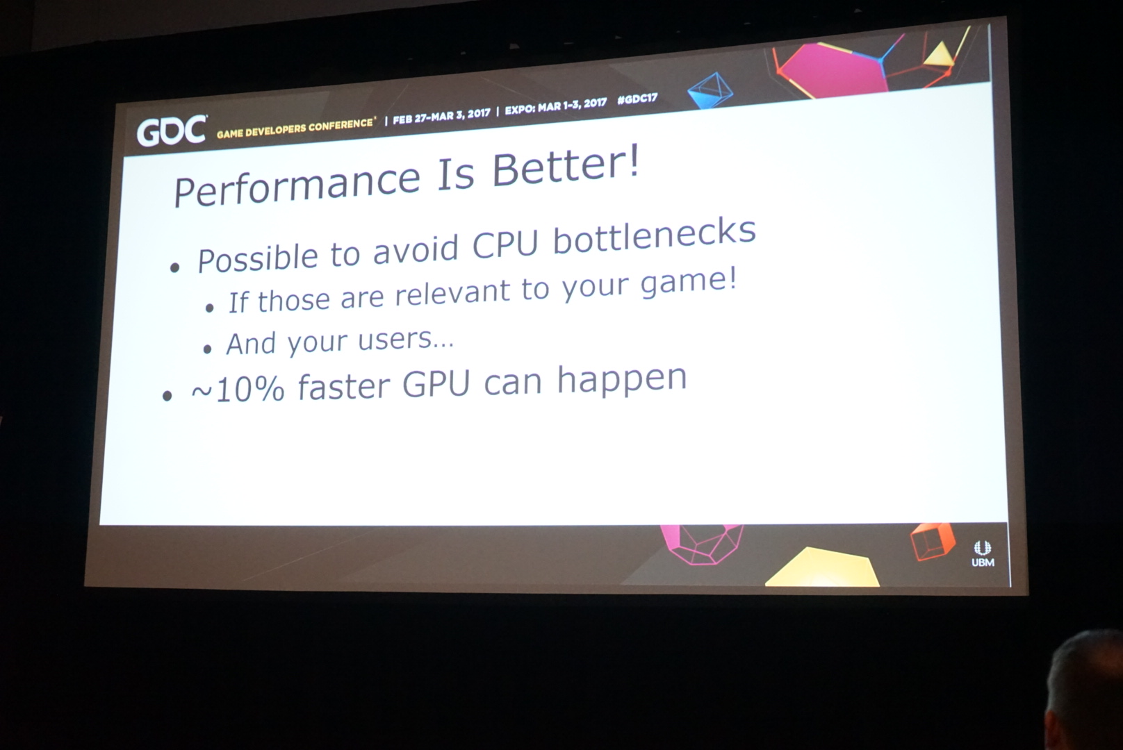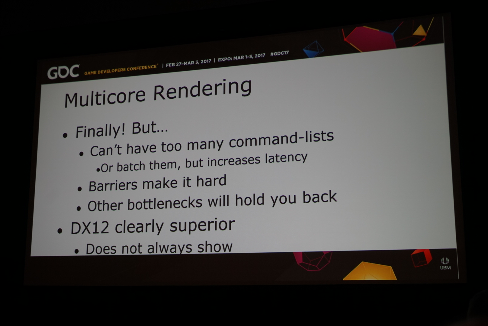 Auch ein Entwickler von Ubisoft (für die Assassins Creed Spiele) machte eine ähnliche Erfahrung und meinte in einem späteren Talk das ein direkter Port auf DirectX 12 ohne Optimierungen zu einer deutlich verringerten Performance führte (200% laut Folie).