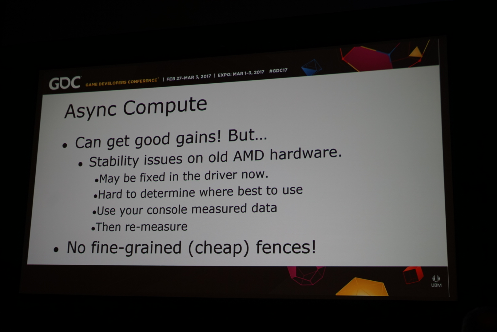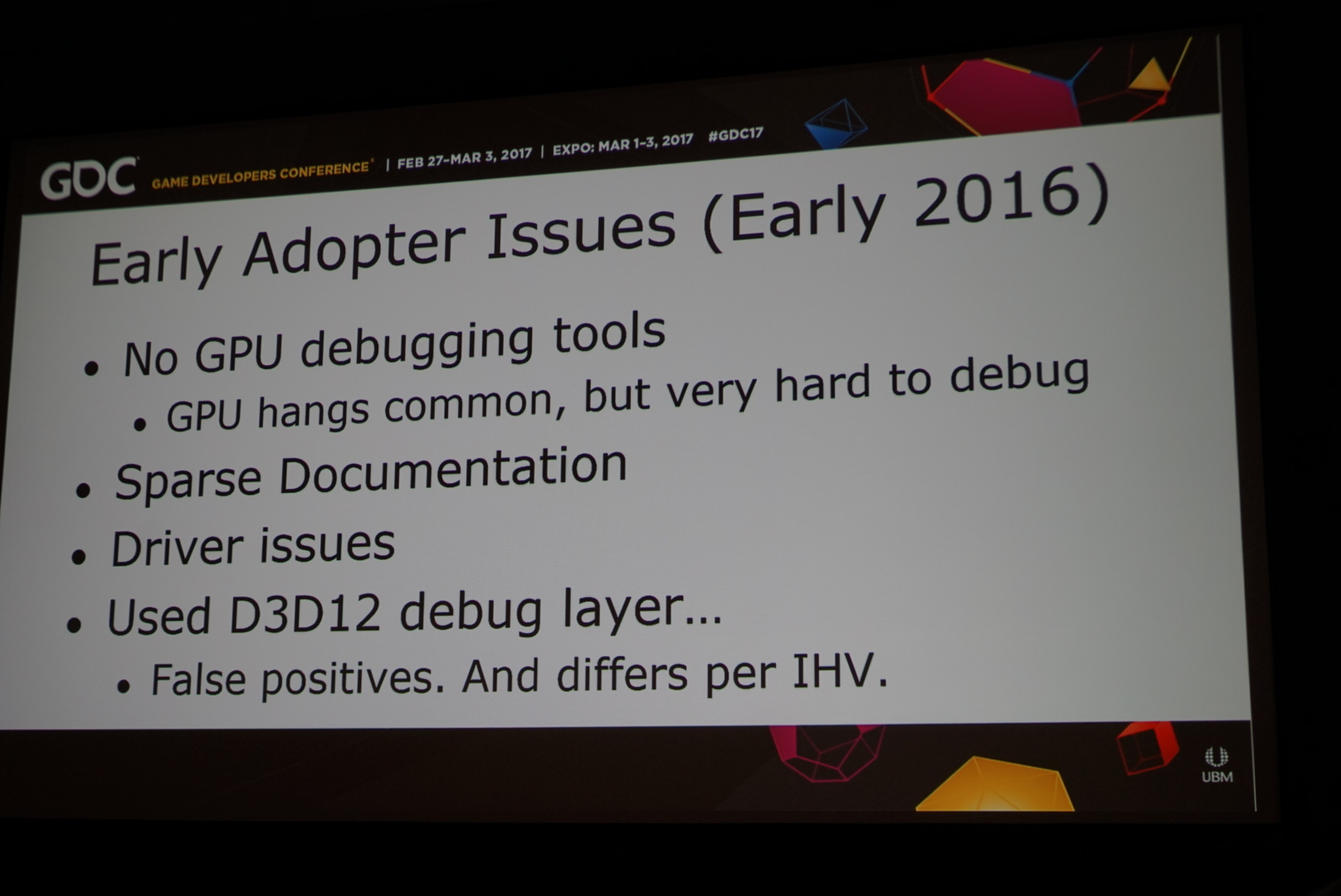 Im Gespräch identifiziert er zahlreiche Fallstricke bei der Softwareentwicklung und macht direkt klar, dass es nicht leicht ist, die Spiele-Performance mit DirectX 11 zu schlagen. 2016 musste sich Nixxes vor allem mit Early-Adopter-Problemen von DirectX 12 herumschlagen. Fehlende Debugging Tools, spärliche Dokumentationen und langwierige Treiberprobleme machten die DirectX-12-Versionen zu einer mühsamen Erfahrung. Dies führte auch zu den späten Nachreichungen der DirectX-12-Versionen der genannten Spiele. Auch wenn diese Probleme über die Zeit weniger werden, warten weiterhin zahlreiche Schwierigkeiten. Vor allem die Speicherverwaltung von DirectX 12 ist sehr unterschiedlich zu DirectX 11 und anfällig, wenn man den physischen Grafikspeicher überfüllt. Durch den low-level-Ansatz gibt es auch zahlreiche Leistungsunterschiede je nach verwendeter Hardware. Dadurch muss man sehr viele Hardwarekombinationen durchtesten um Performance-Bottlenecks auf den meisten Plattformen zu finden. Zu guter Letzt ist die gewonnene Performance durch den verminderten Overhead leicht verdeckt, in dem man z.b. GPU-limitiert arbeitet. Ein schneller Prozessor und hohe Grafikeinstellungen sowie Auflösungen können die Gewinne maskieren, wodurch der Nutzer keinen Unterschied zu DirectX 11 feststellt. Async-Compute ist derzeit der richtige Weg für die Zukunft, bringt jedoch hauptsächlich auf Konsolen spürbare Vorteile.