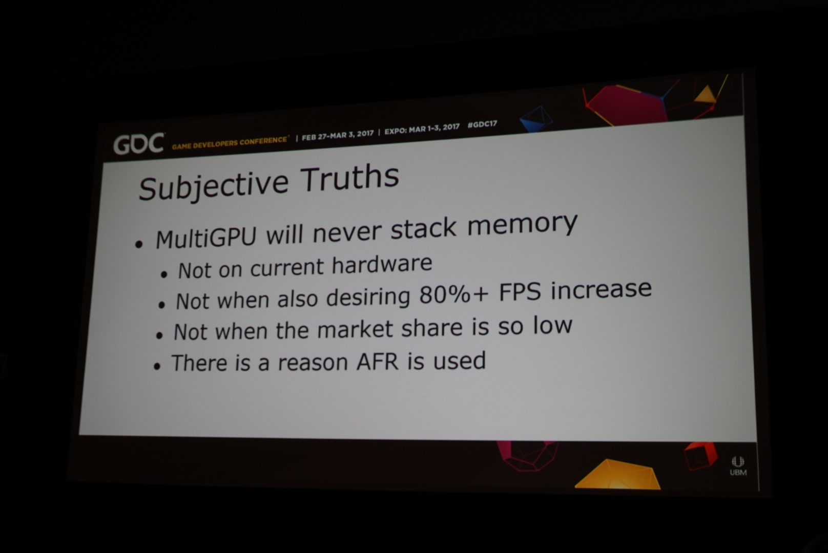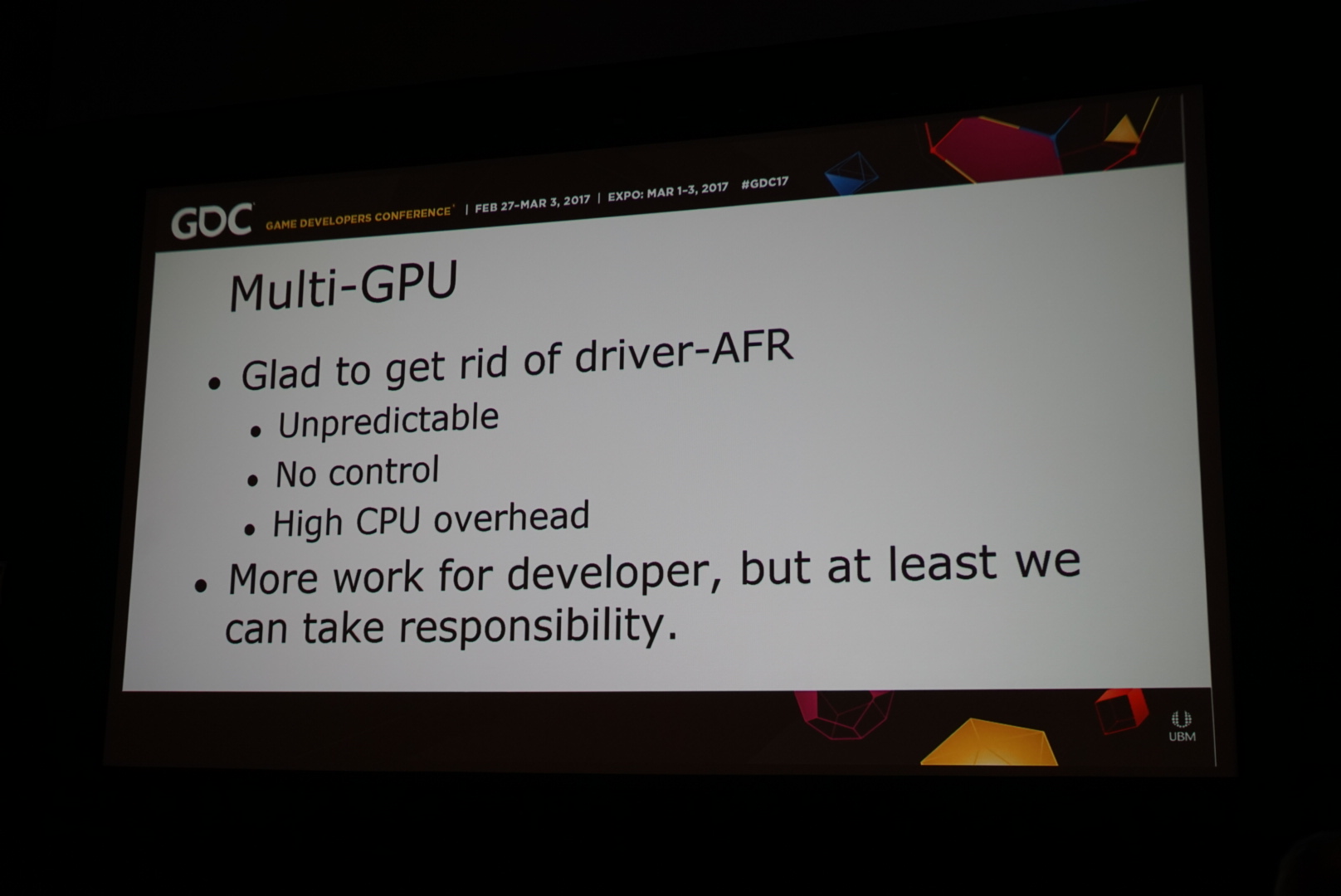 Multi-GPU mit DirectX 12 ist einer der erwähnten positiven Punkte von DirectX 12. Hier sind die Developer froh über die gewonnene Kontrolle, da AFR im Treiber nicht ideal ist (unberechenbare Ergebnisse, keine Kontrolle, hoher CPU-Overhead). Die meisten Performancevorteile sah Nixxes auch für SLI- und CF-Nutzer bei DX12 verglichen mit DX11. Das mystische Memory Stacking (das volle nutzen des Grafikspeichers beider Karten) wird laut Katsman jedoch nicht kommen. Zwei Grafikkarten mit 4 GB im SLI-Modus werden also weiterhin nur 4 GB Grafikspeicher für die Spiele zur Verfügung stellen. Es wäre technisch zwar wahrscheinlich möglich, aber die Zielgruppe ist zu klein, wodurch man wohl beim einfachen AFR Modus bleibt.