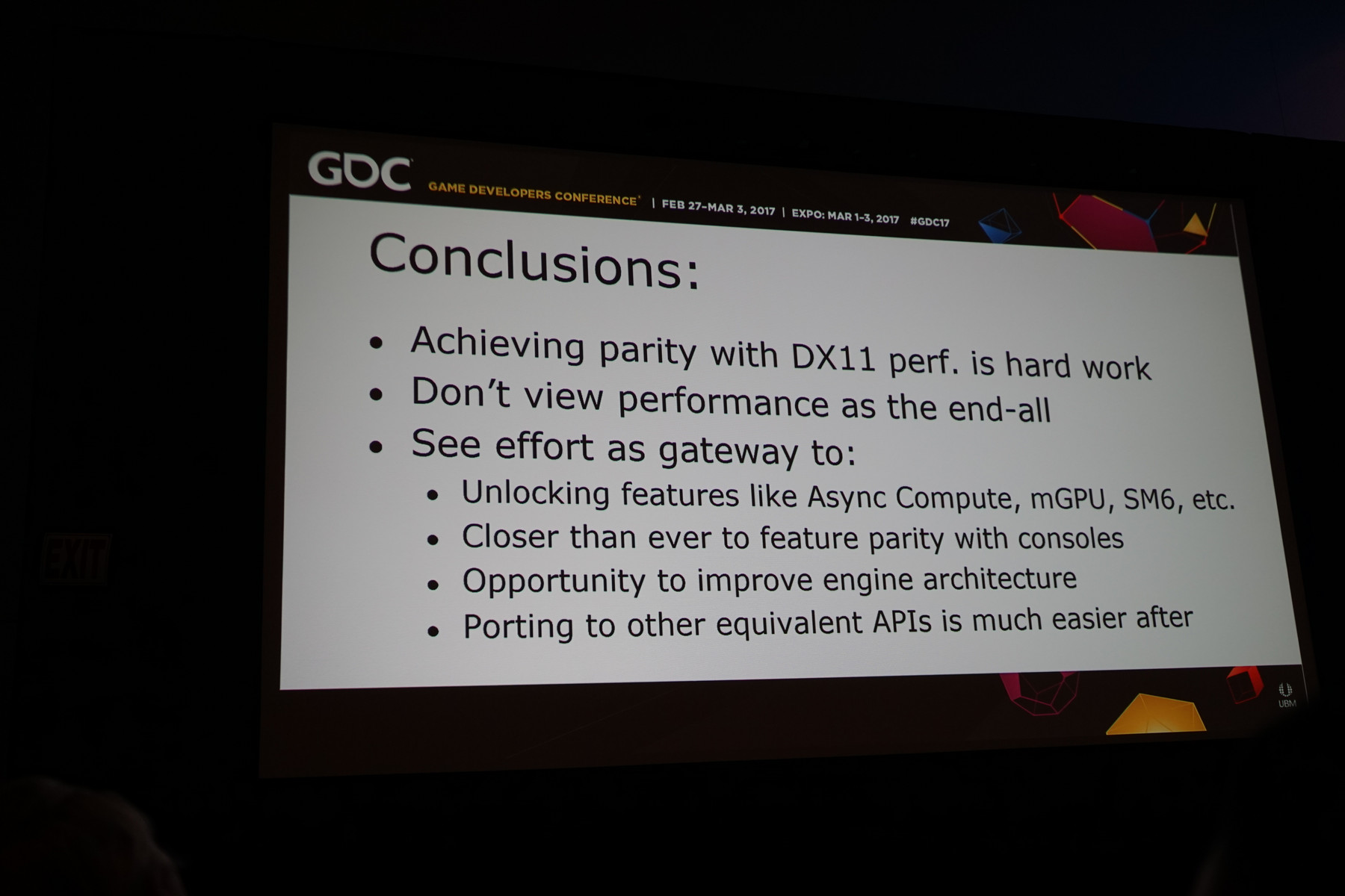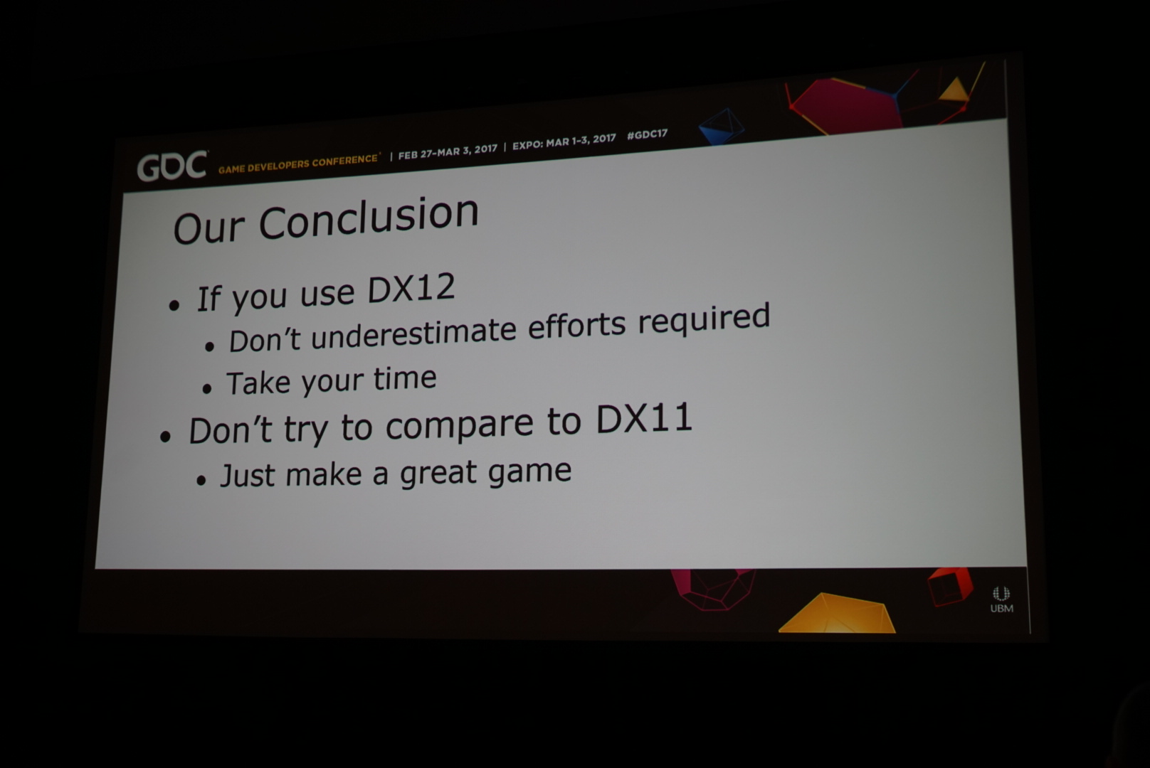 Zusammenfassend ist eine Umstellung von DirectX 11 auf DirectX 12 laut Katsman ein hoher Aufwand. Memory Management ist der schwierigste Teil von DX12 und man hat auch mit den hohen Erwartungen der Nutzer zu kämpfen. Realistisch ist ein Performancegewinn von maximal 10 %, wodurch sich die Frage für die Developer nach dem Nutzen einer DirectX 12 Version stellt. Katsman ist hier verhalten positiv, es zeigt sich jedoch, dass der DirectX-12-Hype nicht ganz gerechtfertigt war und wir auch in naher Zukunft keine Wunder von API erwarten sollten.