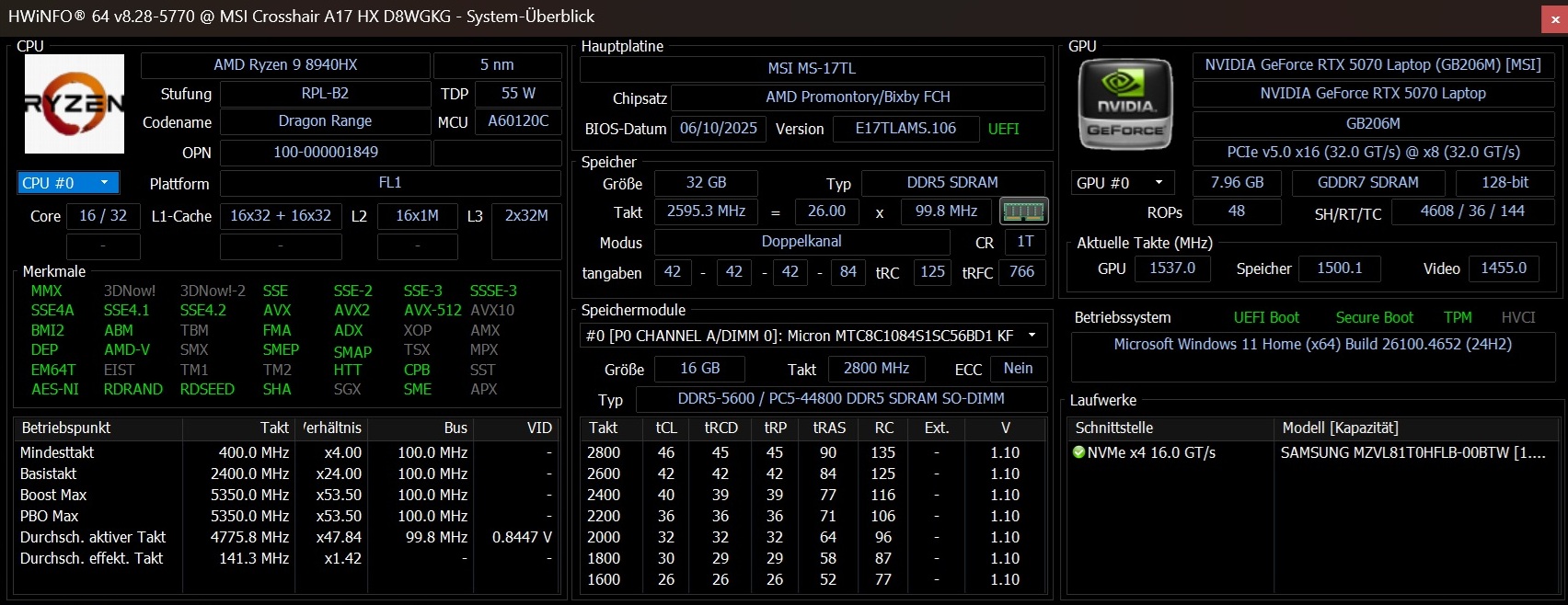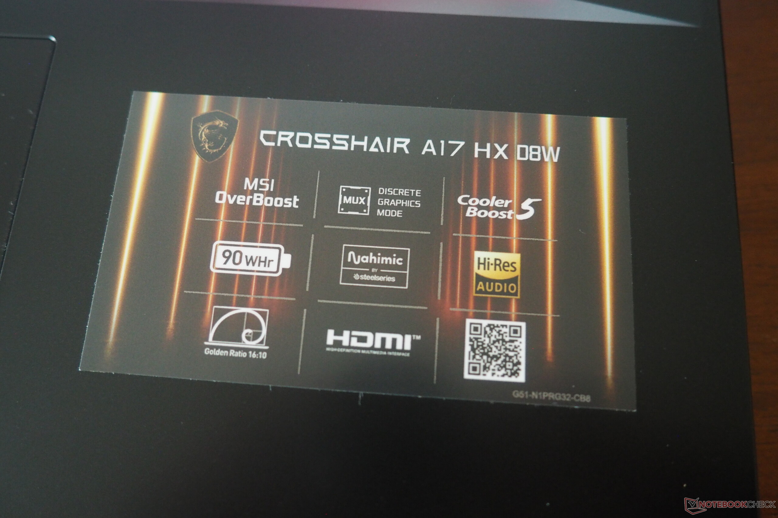 | MSI Crosshair A17 HX D8WGKG AMD Ryzen 9 8940HX ⎘ NVIDIA GeForce RTX 5070 Laptop ⎘ 32 GB RAM, 1024 GB SSD | Amazon: Geizhals Suche | 2.9 kg | 29.7 mm | 17.00" 2560x1600 178 PPI IPS | |
