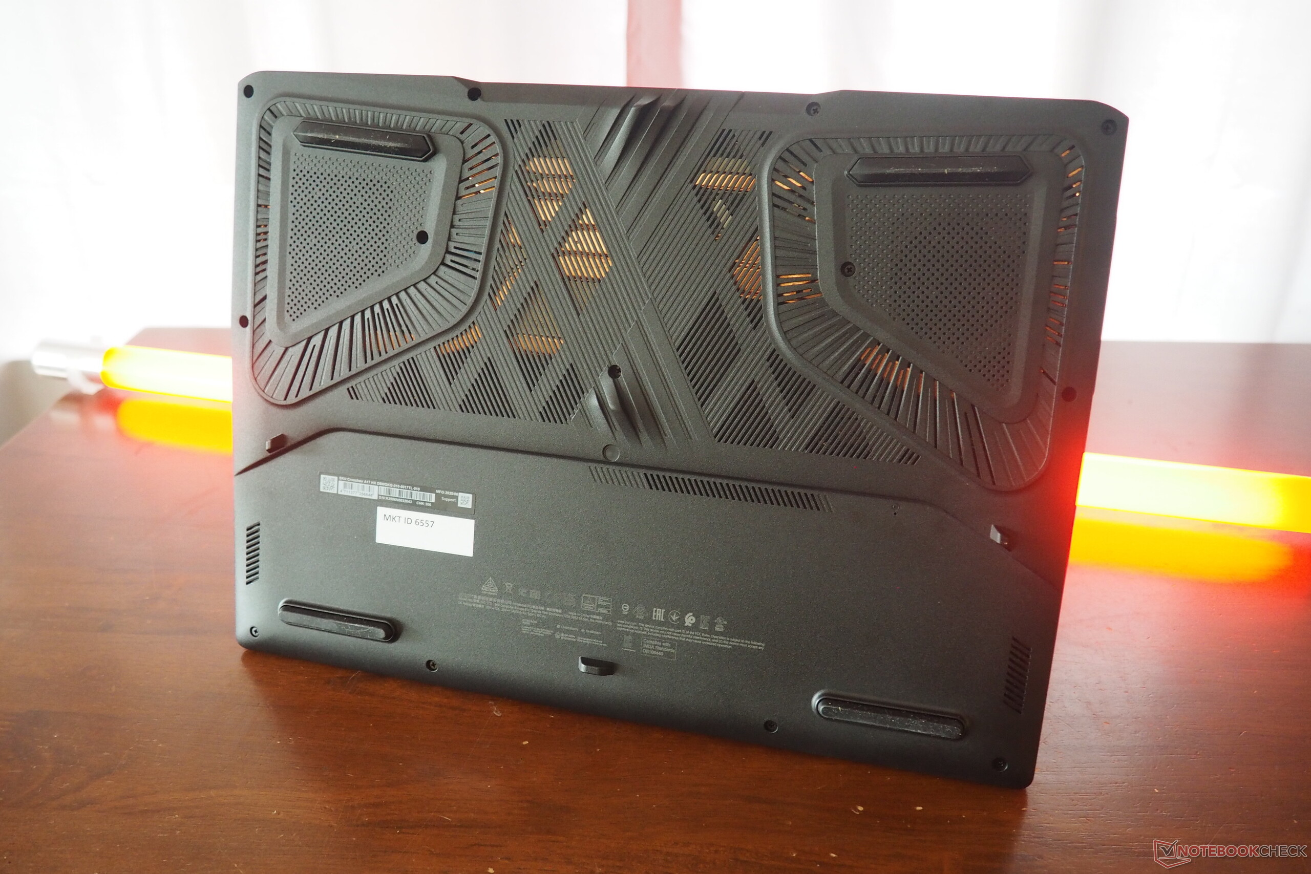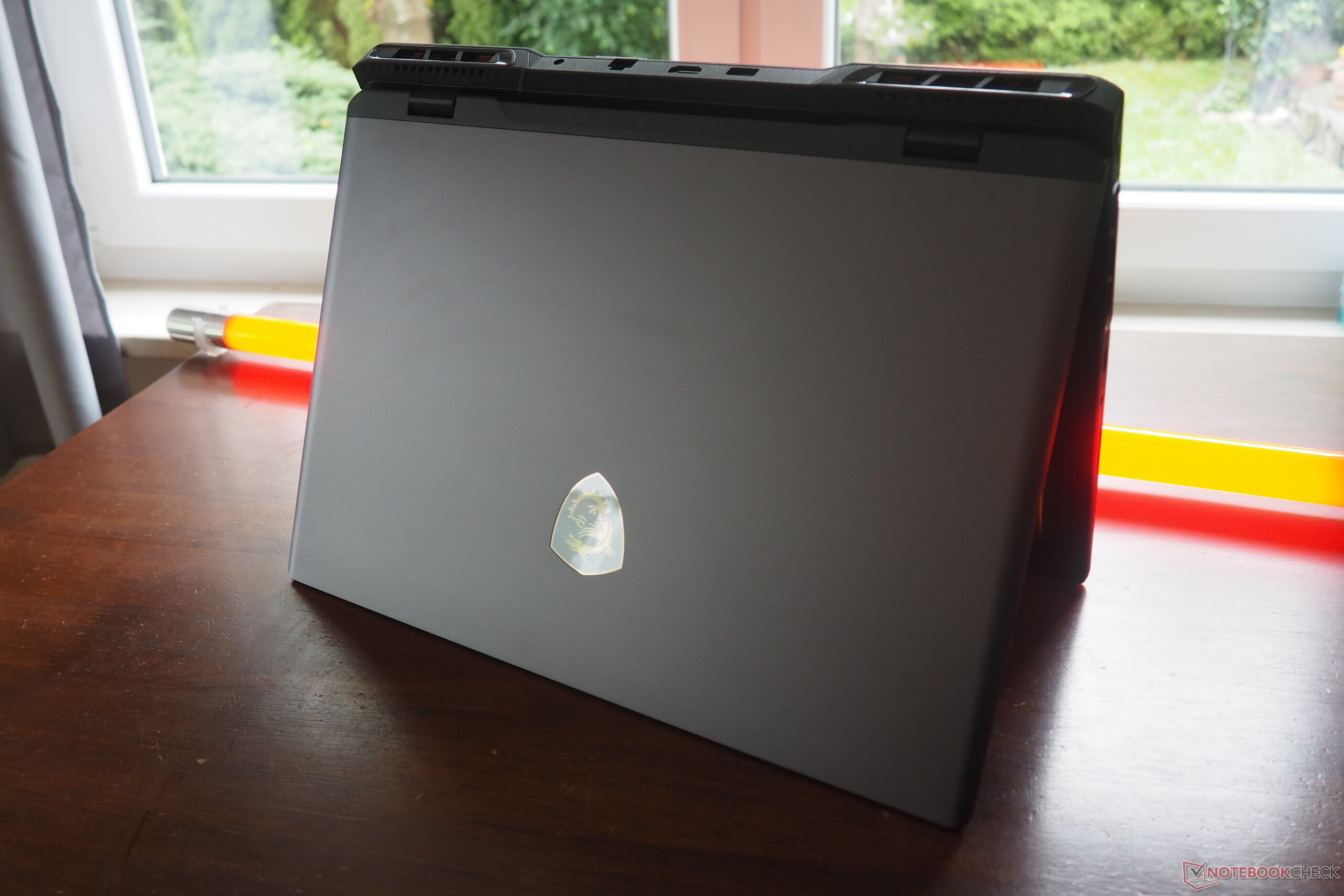 Beim Gehäuse setzt MSI auf einen Materialmix. Während der Deckel aus Metall gefertigt ist, besteht die Baseunit aus recht stabilem Kunststoff. Als großer Pluspunkt wäre der üppige Öffnungswinkel von 180° zu nennen, was nicht jeder Gamer bietet. Designtechnisch tobt sich der Hersteller vor allem auf dem Gehäuseboden aus (siehe Fotos), das restliche Chassis ist optisch noch halbwegs dezent bzw. gediegen. Mit einem Gewicht von 2,9 kg ist das Crosshair A17 schwerer als die gewählten Kontrahenten, wobei letztere größtenteils nur 16- statt 17-Zoll groß sind. Auch hinsichtlich der Bauhöhe (knapp 3 cm ohne Füße) spielt das Crosshair A17 eher oben mit.