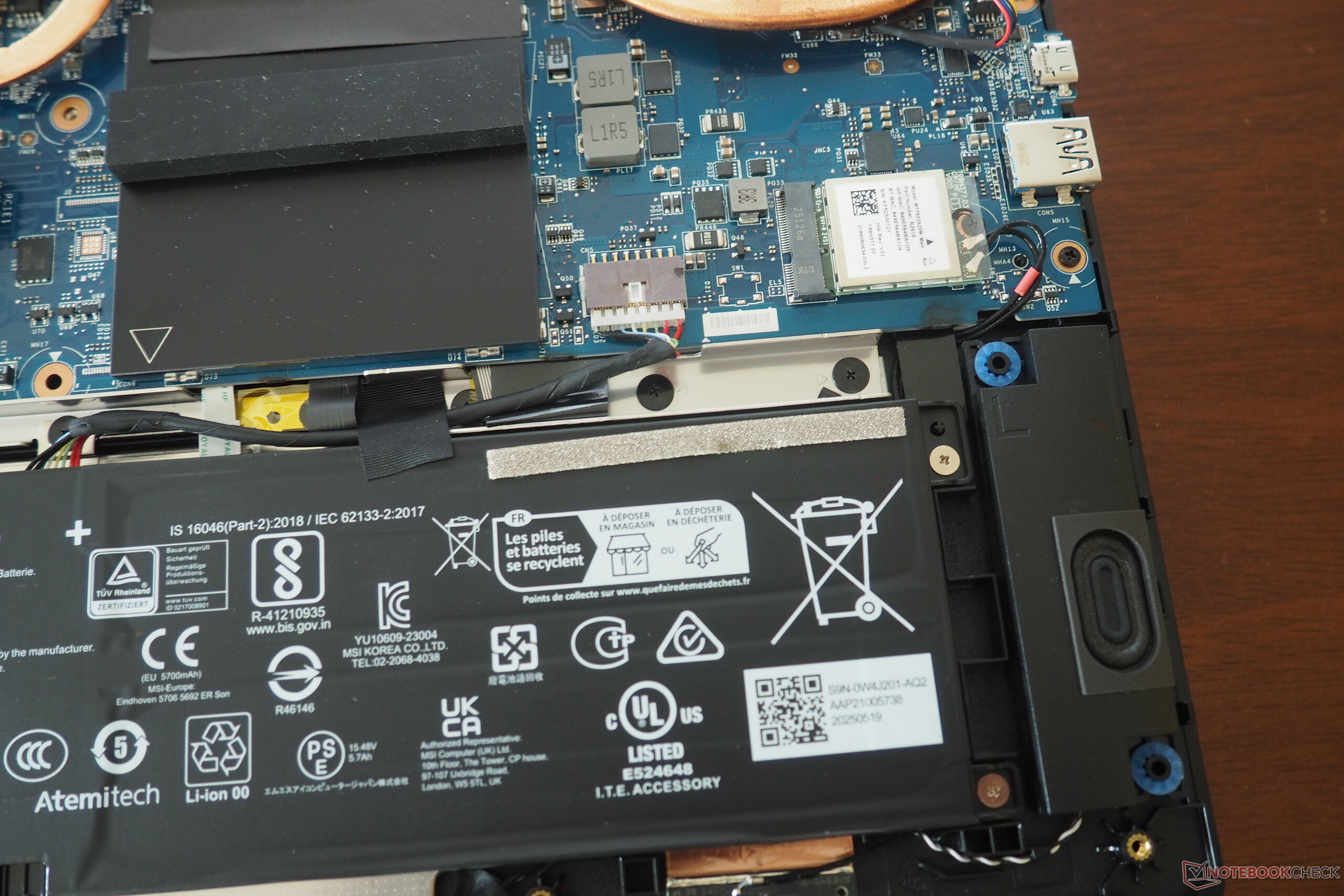 Auf modernes USB 4 bzw. Thunderbolt muss der Gaming-Spross verzichten. Bei den vier vorhandenen USB-Ports vertraut MSI auf den nicht mehr ganz aktuellen 3.2-Gen2-Standard, wobei der Typ-C-Port immerhin DisplayPort und PowerDelivery 3.0 beherrscht. Externe Monitore lassen sich am einfachsten per HDMI 2.1 verbinden. Dazu gesellen sich eine Audio-Buchse, ein Gigabit-LAN-Port und eine Öffnung für Kensington Locks. Einen Cardreader hat sich der Hersteller gespart. Die drahtlose Kommunikation erfolgt über einen Wi-Fi 6E Chip von MediaTek (Modell RZ616), der speziell beim Empfangen eine gute Vorstellung abliefert. Die Qualität der HD-Webcam hält sich derweil in Grenzen, neben der Farbtreue könnte auch die Bildschärfe besser sein. Die Wartung des Crosshair A17 erfordert etwas Geduld, da vor dem Lösen der Bodenplatte erst einmal 13 Kreuzschrauben entfernt werden müssen. Fotos vom Innenaufbau sehen Sie weiter unten.