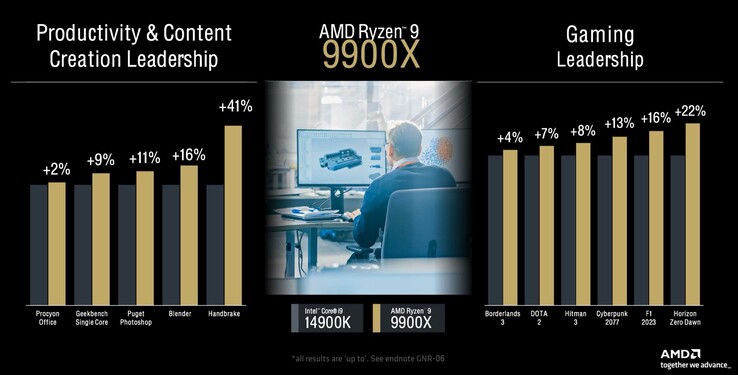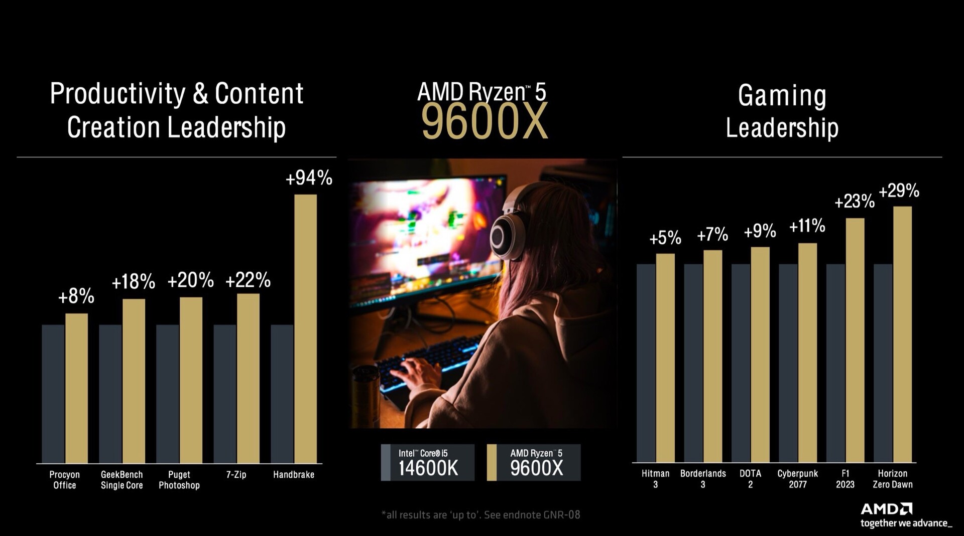 Der Ryzen 5 9600X soll bei Handbrake sogar annähernd die doppelte Performance des Intel Core i5-14600K erreichen, und auch beim Zocken 5 bis 29 Prozent schneller sein. Wie üblich sollten Hersteller-Benchmarks mit Vorsicht betrachtet werden.