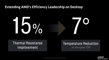 AMD betont, dass die TDP aller Chips außer jener des Ryzen 9 9950X reduziert werden konnte, obwohl die Multi-Thread-Performance je nach Chip um 11 bis 22 Prozent gestiegen ist. Selbst wenn die Chips mit derselben TDP betrieben werden, soll die höhere Effizienz der Zen 5-Architektur zu 7 Grad Celsius niedrigeren Temperaturen unter Last führen. Nutzer, die weniger an Effizienz und Stromverbrauch interessiert sind, und stattdessen die höchstmögliche Leistung erzielen möchten, können Ryzen 9000 per Precision Boost Overclock (PBO) übertakten, um eine bis zu 15 Prozent höhere Leistung zu erzielen.