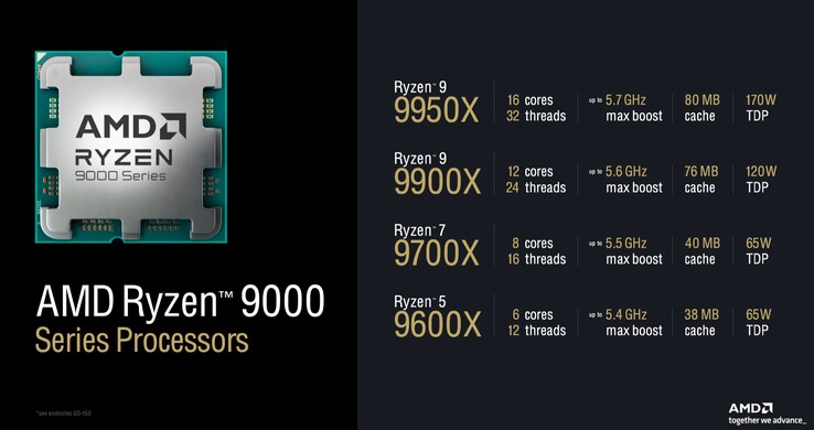 Mit Ryzen 9000 bringt AMD die Zen 5-Architektur erstmals auf den Desktop, nachdem der Ryzen AI 9 HX 370 die neuen CPU-Kerne bereits für Notebooks bietet. Zum Start bietet AMD insgesamt vier neue Prozessoren an, angeführt vom Ryzen 9 9950X, der 16 Kerne, 32 Threads, Boost-Taktfrequenzen von 5,7 GHz und eine TDP von 170 Watt besitzt.