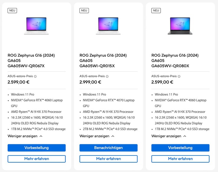 Bei Asus Deutschland werden bereits Vorbestellungen für eines dieser Modelle entgegen genommen, nämlich für das ROG Zephyrus G16 (2024), das in Deutschland ab dem 22. Juli 2024 ausgeliefert werden soll. Das schlanke Gaming-Notebook wird mit Ryzen AI 9 HX 370, Nvidia GeForce RTX 4060 Laptop-GPU, 240 Hz OLED-Display, 32 GB RAM und einer 1 TB SSD für 2.499 Euro angeboten. Damit kostet die Strix-Point-Version exakt gleich viel wie das ansonsten identisch ausgestattete Modell auf Basis des Intel Core Ultra 9 185H.