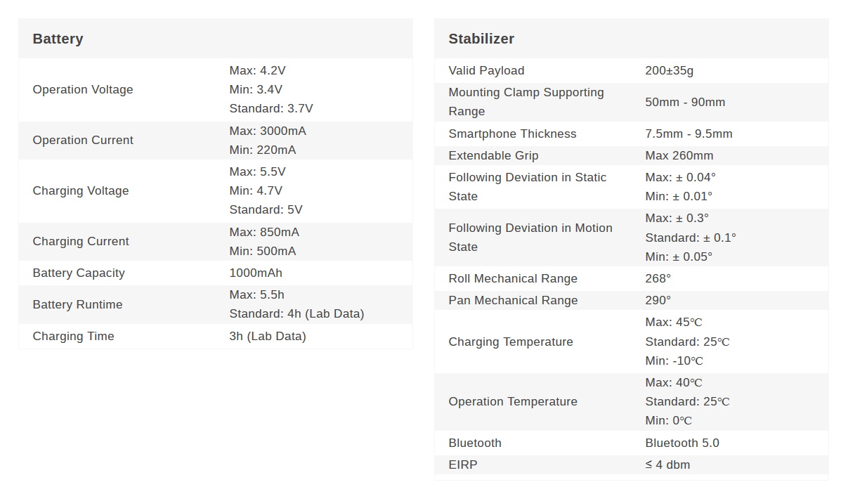 Der Smooth Xs stabilisiert wie gesagt auf zwei Achsen. Der Hersteller spricht davon, dass er eine Laufzeit von maximal 5,5 Stunden aufweist, damit kommt man gut über den Tag, sofern man ihn ab und zu auch ausschaltet und nicht kontinuierlich filmt. Realistisch gesehen kommt man eher auf 4 Stunden Betriebszeit. Der integrierte Akku besitzt eine Kapazität von 1.000 mAh und ist somit deutlich kleiner als der Akku des DJI OM 4 (2.450 mAh). Über den integrierten USB-C-Anschluss wird der Akku geladen und hier lässt sich unterwegs auch einfach eine Powerbank anschließen, was die mobile Laufzeit natürlich deutlich erhöht. Allerdings ist dies nur während der Filmpausen sinnvoll, beim Filmen müsste man durch ein langes Kabel dafür Sorge tragen, dass der Gimbal nicht auch noch die Powerbank tragen muss. In etwa 3 Stunden ist der Akku wieder voll aufgeladen, übermäßig schnell geht das also nicht, die Ladezeit des beinahe 150 Prozent größeren Akkus des Konkurrenten beträgt nur 2,5 Stunden.