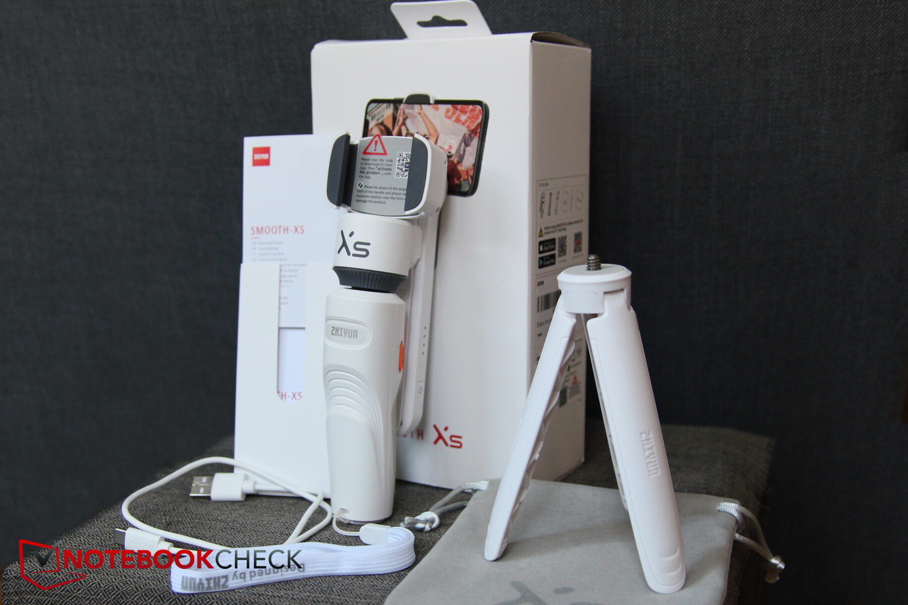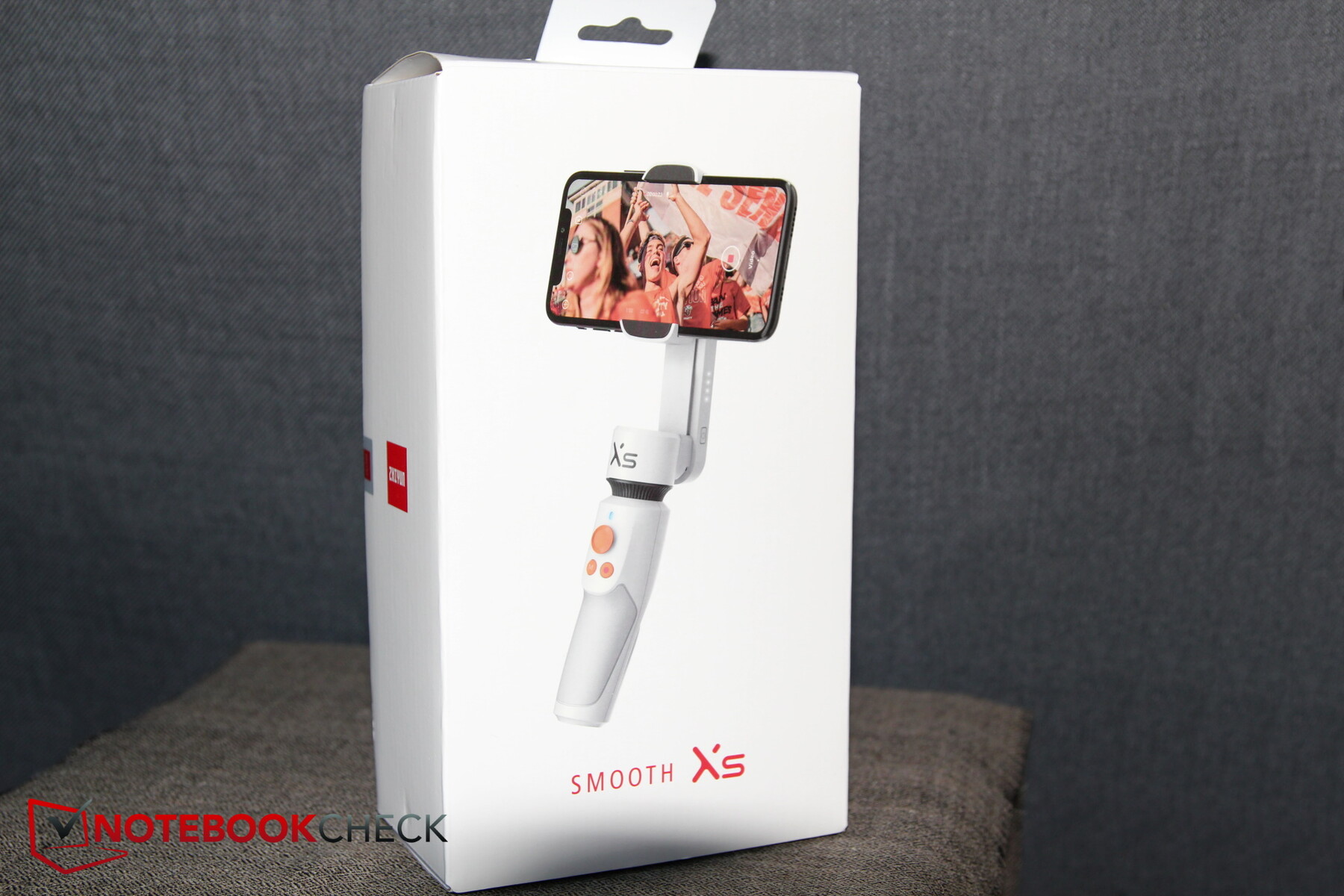 Der Smooth Xs kommt in einer edel-weißen Verpackungsbox daher. Im Inneren befindet sich natürlich der Gimbal selbst, aber auch ein ausklappbares Mini- oder Tischstativ, ein kurzes USB-C-Kabel zum Aufladen des Gimbals, eine graue Tragetasche, eine Trageschlaufe, ein "Must-Read"-Blatt, eine Kurzanleitung und ein 10-mal so dickes Heft zum Haftungsauschluss. Alle Zubehörteile außer der Tragetasche sind wie der Gimbal selbst ebenfalls in Weiß gehalten. Auf der Verpackung prangt neben einer Auflistung des Inhalts und dem Foto des Gimbals noch ein QR-Code zum Herunterladen der zwingend notwendigen Software.