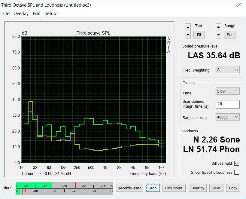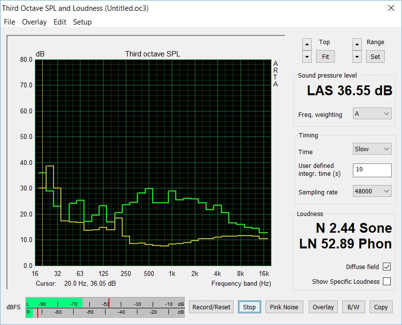 Werden eine oder mehrere Anwendungen aktiv genutzt und die CPU gefordert, so erhöht sich die Lautstärke auf ca. 35 dB. Liegt die CPU-Auslastung bei annähernd 100 Prozent (Stable Diffusion + 7Zip-Benchmark in Ubuntu-VM), so steigen die Lüftergeräusche auf bis zu 36.6 dB und pendeln dann zwischen diesem Wert und 35 dB. Kurzzeitig stieg der Geräuschpegel anfangs gar auf 44,5 dB.