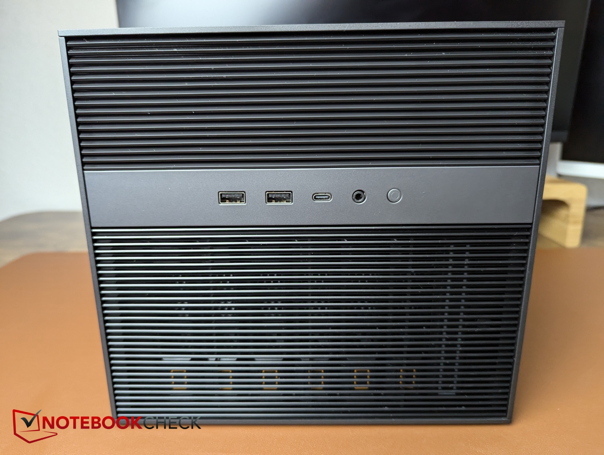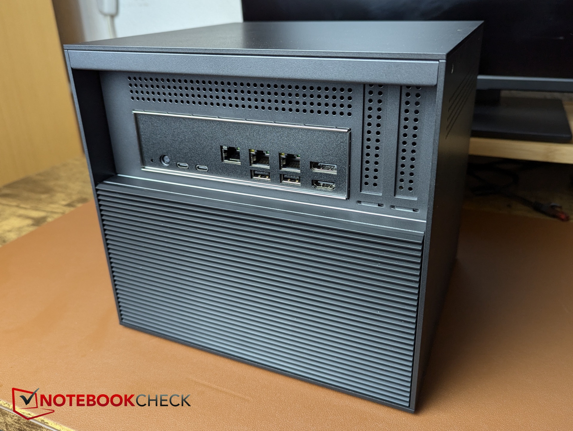 Front und Rückseite des Cubes sind mit Kunststoffgitter-Blenden verziert. Vorne lässt sich die untere Blende abnehmen, darunter befinden sich die 6 Hot-Swap-Laufwerksschächte sowie die Vierfach-M.2-Bay. Auch hinten lässt sich wahlweise die Blende abnehmen, darunter kommen die beiden 80-mm-Gehäuselüfter zum Vorschein.