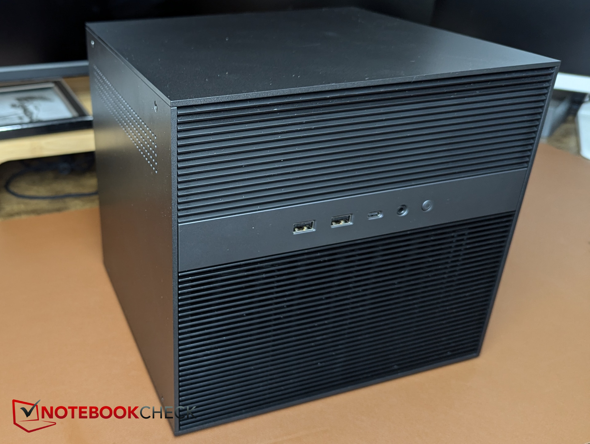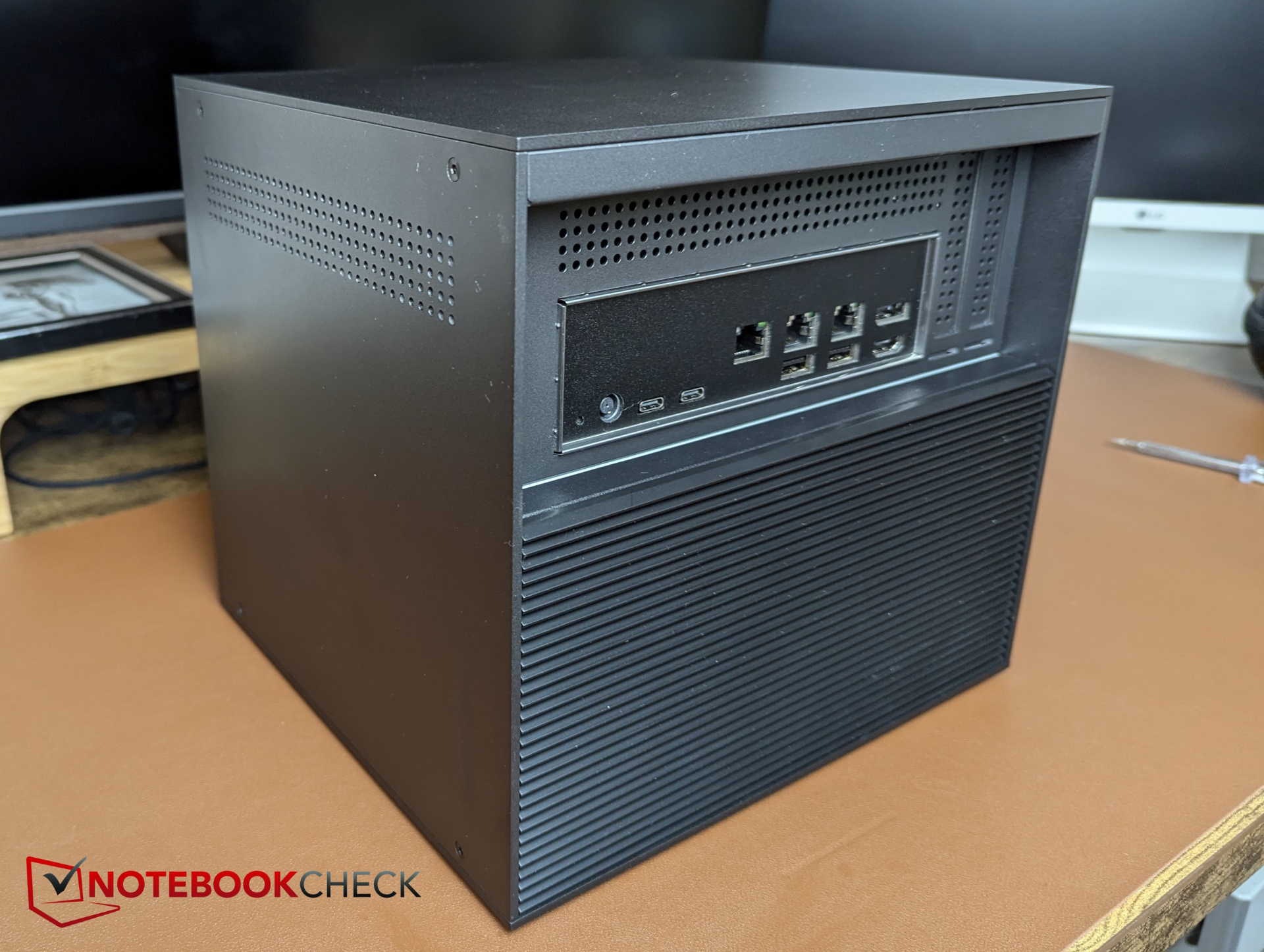 Um in das Würfelinnere zu gelangen genügt es, an der oberen Kante vier Torxschrauben zu lösen, danach lässt sich die metallene Oberplatte abnehmen. Innen hat man Zugang zur CPU mit ihrem großen Kühler, den beiden RAM-Slots, den M.2-Slots inklusive der OS-SSD mit 256 GB. Bei Bedarf kann man hier auch die beiden PCIe-Slots besetzen.