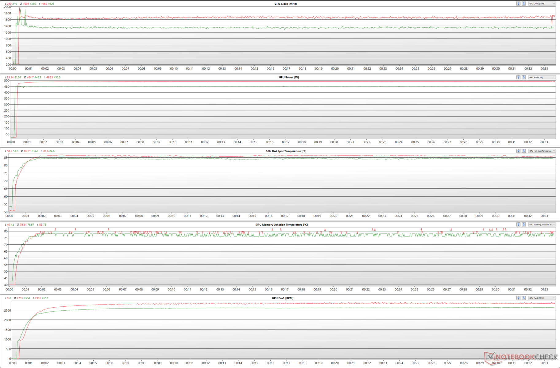 Eine Erhöhung des TGP auf 495 W führt zu fast 200 MHz höheren Takten knapp über der 1.600-MHz-Marke, was jedoch zu Hot-Spot-Temperaturen von über 85 °C und folglich zu höheren Lüfterdrehzahlen von fast 3.000 U/min führt.