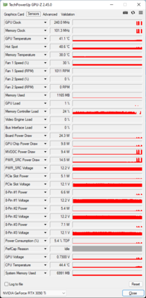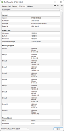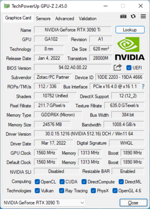 Die RTX 3090 Ti AMP Extreme Holo läuft mit einem Basistakt von 1.560 MHz und ist für einen Boost von bis zu 1.890 MHz ausgelegt. Wie bei Nvidia Karten üblich kann der Basistakt deutlich niedriger ausfallen - wir haben im Leerlauf rund 210 MHz beobachtet -, während der Boost-Takt je nach Last und verfügbarem thermischen Headroom weiter ansteigen kann.