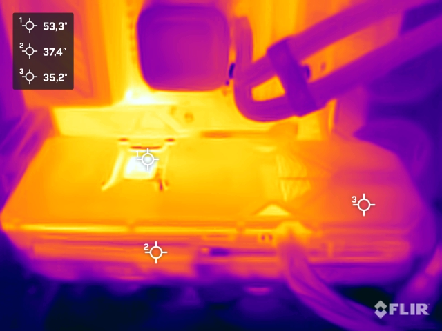 Zotac stattet die GeForce RTX 5070 Ti AMP Extreme mit einem leistungsstarken Kühlsystem aus. Drei groß dimensionierte Lüfter und ein massiger Kühlkörper sorgen für eine effiziente Wärmeabfuhr und bleiben im Leerlauf und bei geringer Last jedoch abgeschaltet. Unter Volllast drehen die Lüfter dann allerdings ordentlich auf, sodass wir im offenen Aufbau einen Schalldruckpegel von etwa 47 dB(A) messen. Verglichen mit anderen leistungsstarken Grafikkarten ist das deutlich lauter, wenngleich beim Spielen der Schalldruckpegel mit 42 dB(A) klar geringer ausfällt.