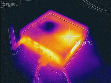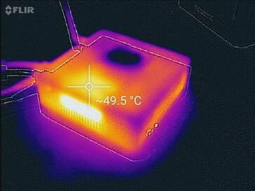 Insgesamt geht der ZBOX MI642 Nano mit der entstehenden Hitze recht gut um. Aufgrund des kompakten Gehäuses ist nicht allzu viel Platz für optimierten Luftfluss, wodurch es unter Last sehr warm wird und oberhalb der CPU bis zu 50 °C erreicht. Um das Kühlvermögen nicht negativ zu beeinflussen, sollte auf der Oberseite also tunlichst nichts abgelegt werden. Auch gilt zu bedenken, dass kühle Luft an der rechten Seite angesaugt und auf der linken Seite wieder rausgeblasen wird. Auch diese Lüfteröffnungen sollten also auf alle Fälle offen bleiben.