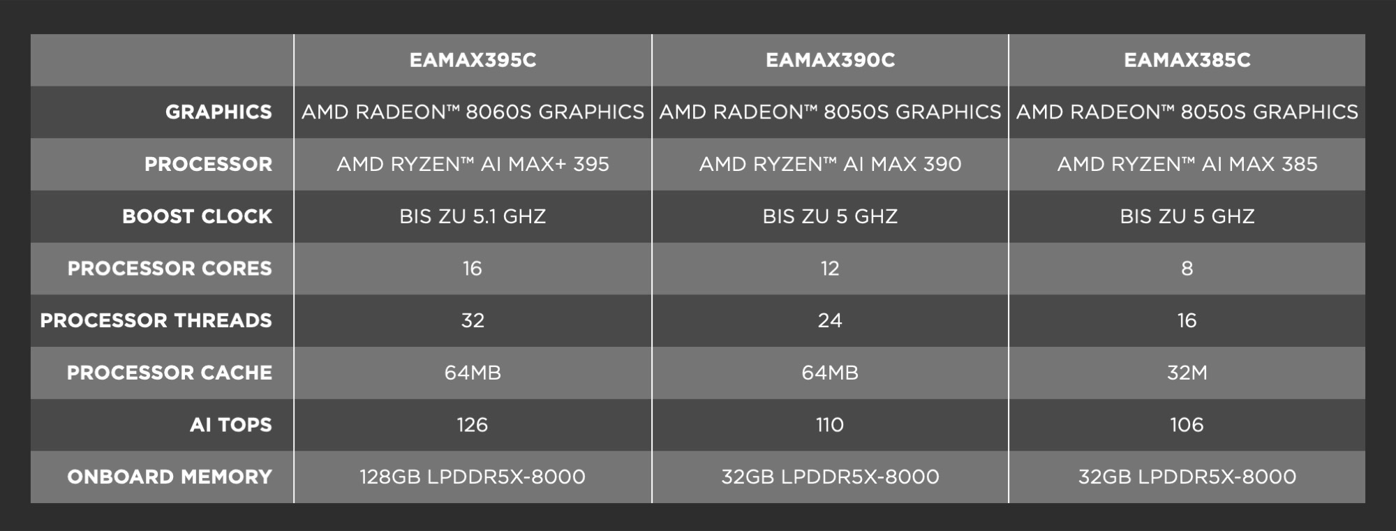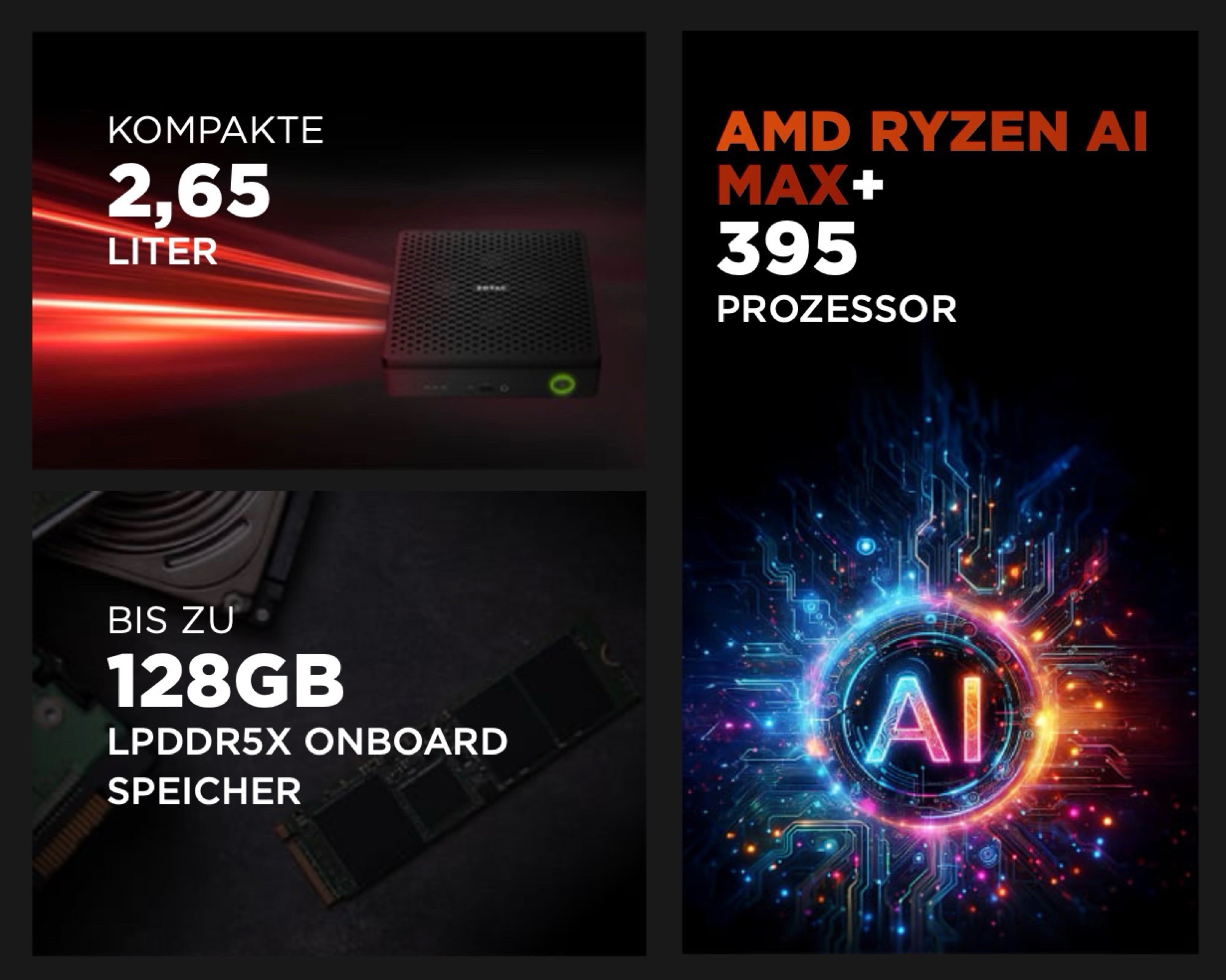 Zotac hat noch nicht bestätigt, wann oder zu welchem Preis die ZBox Magnus (EAMAX395C) auf den Markt kommen wird. Der Mini-PC wird wahlweise als Barebones oder mit 1 TB SSD und Windows 11 angeboten, je nach Variante bietet der Mini-PC den Ryzen AI Max 385 mit 32 GB RAM, den Ryzen AI Max 390 mit 32 GB RAM, oder den Ryzen AI Max+ 395 mit 128 GB RAM. Nähere Details sind auf der Webseite von Zotac zu finden.