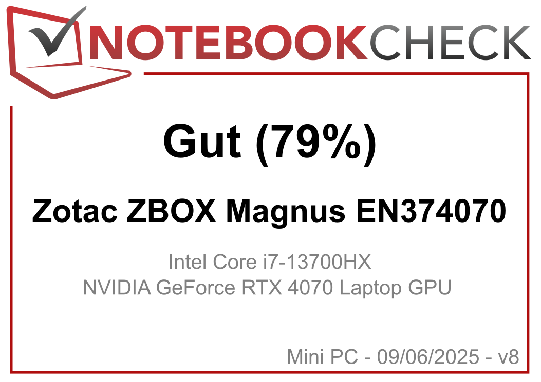 | Zotac ZBOX Magnus EN374070 Intel Core i7-13700HX ⎘ NVIDIA GeForce RTX 4070 Laptop GPU ⎘ 16 GB RAM | Amazon: Geizhals Suche | 1.6 kg | 203 x 210 x 62.2 mm | |
