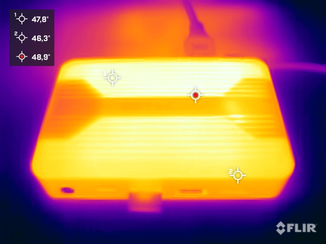 (-) Auf der Unterseite messen wir eine maximalen Wert von 62.8 °C (im Vergleich zum Durchschnitt von 36.4 °C).
