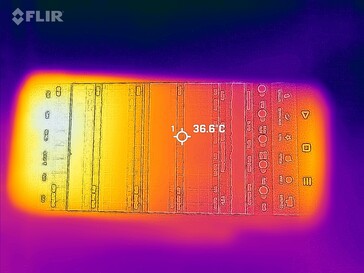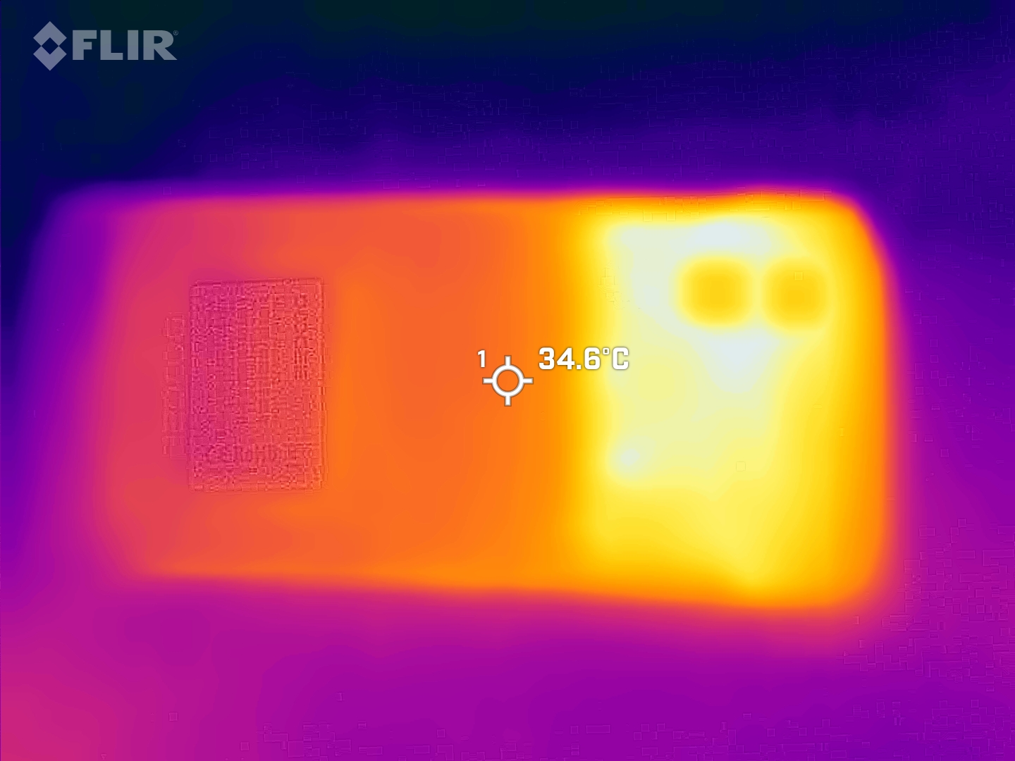 (-) Auf der Unterseite messen wir eine maximalen Wert von 45.4 °C (im Vergleich zum Durchschnitt von 34 °C).