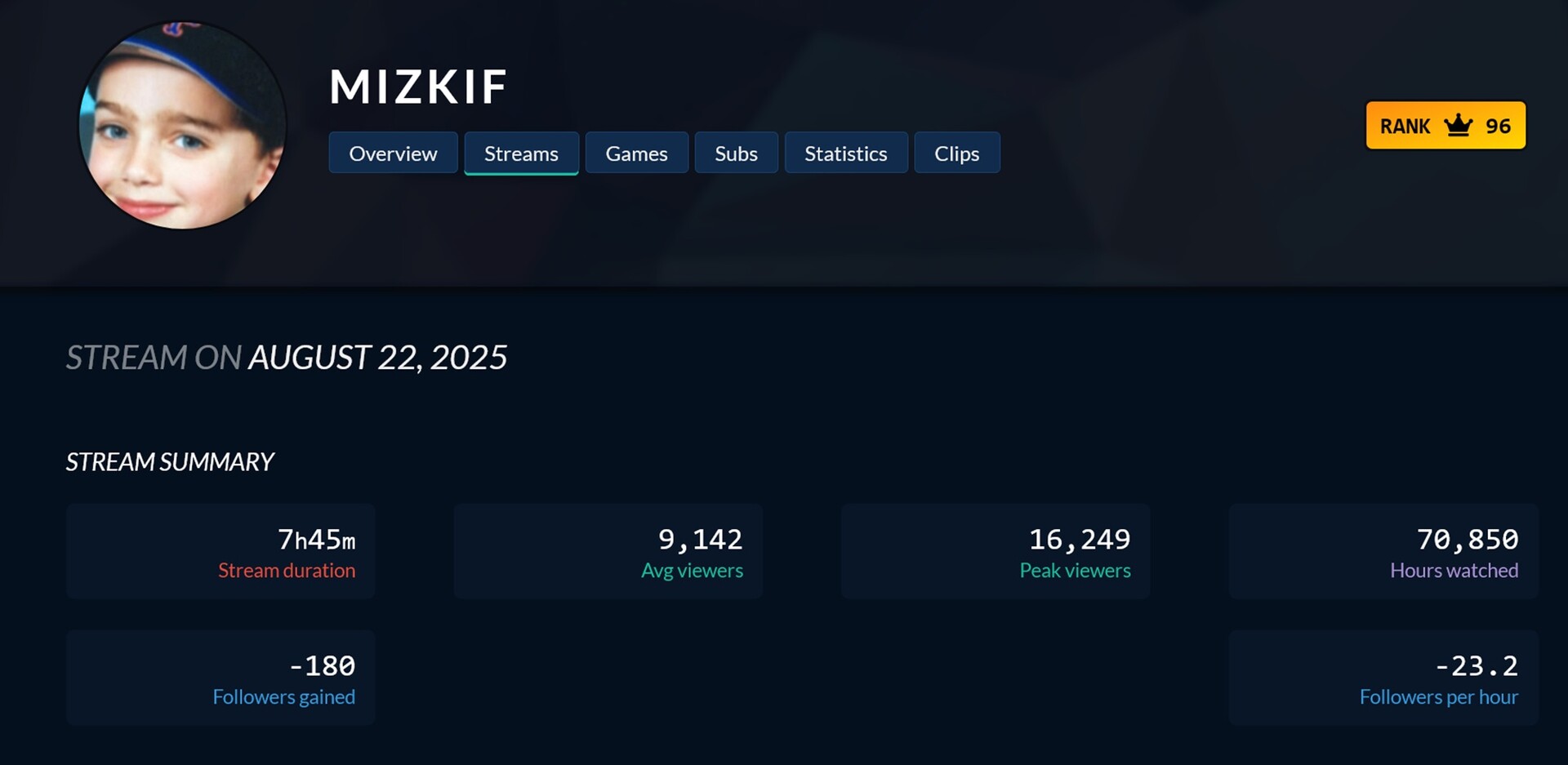 Auch die letzte Übertragung von Mizkif erregte die Aufmerksamkeit des Publikums. Der Mitbegründer der OTK-Organisation hatte durchschnittlich 9.142 Zuschauer, was einen starken Rückgang gegenüber seinem Drei-Monats-Durchschnitt von 17.126 bedeutet. Einige Follower haben bemerkt, dass beliebte Persönlichkeiten in den letzten Tagen das Streamen abgesagt oder vermieden haben.
