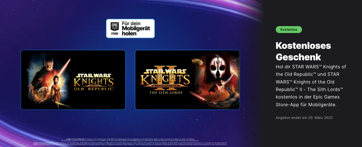 Seit gut vier Wochen gibt es nicht nur im Epic Games Store regelmäßige Freebies, sondern auch im neuen Epic Games Store für Mobile, also Android, iPhone oder iPad. Während im PC Store jede Woche neue kostenlose Spiele bereitstehen, gibt es im Mobile Store nur alle vier Wochen neue Gratis Games. Nach "Bloons TD 6" und "Dungeon Of The Endless: Apogee" gibt es diese Woche zwei echte Klassiker: die beiden Rollenspiele "Knights Of The Old Republic I & II". Beide Games sind wunderbar für Mobilgeräte umgesetzt und bieten neben einer Touch-Bedienung auch Controller-Unterstützung.