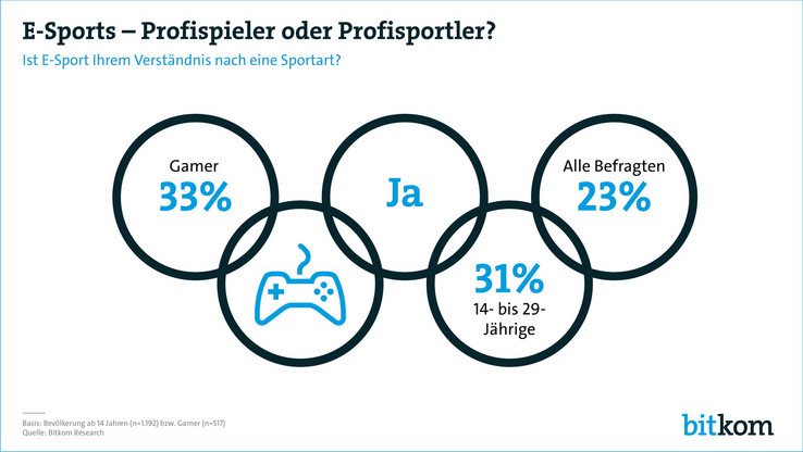 Länder wie China, Brasilien, Finnland oder Südkorea haben E-Sport bereits offiziell als Sportart anerkannt, so der Bitkom. Dass E-Sport in das Programm der Asienspiele 2022 aufgenommen wurde, zeige außerdem, dass auch olympisches Potenzial im E-Sport stecke.
