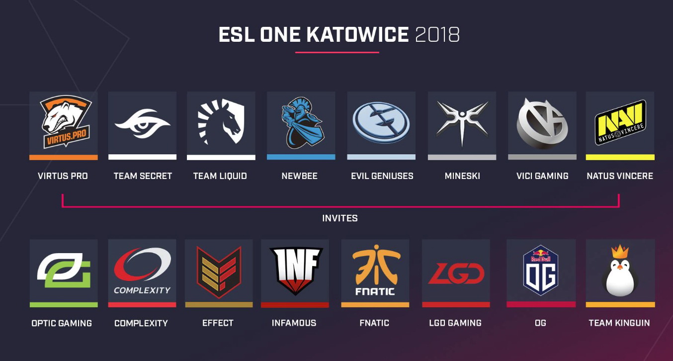 Das ESL One Katowice 2018 powered by Intel ist das fünfte Major in der Competitive Season 2017/2018. Acht der teilnehmenden Teams erhielten direkte Einladungen zum Tournament, acht weitere mussten sich in regionalen Qualifiern in Dota 2 durchsetzen. Hier die teilnehmenden eSports-Teams der ESL One Katowice 2018 im Überblick:
