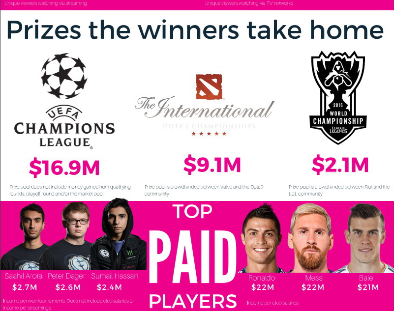 In diesem Zusammenhang hat Fluendo auch ein interessante Infografik zusammengestellt: eSports vs. UEFA Champions League zeigt, dass Spietzen-eSportler wie Saahil Arora, Peter Dager oder Sumail Hassan mittlerweile Millionengehälter einstreichen. Zwar erreichen die Gehaltsschecks noch nicht die Regionen eines Ronaldo oder Messi, zwischen 2,4 und 2,7 Millionen US-Dollar für ein gewonnenes Turnier sind inzwischen aber keine Seltenheit mehr.