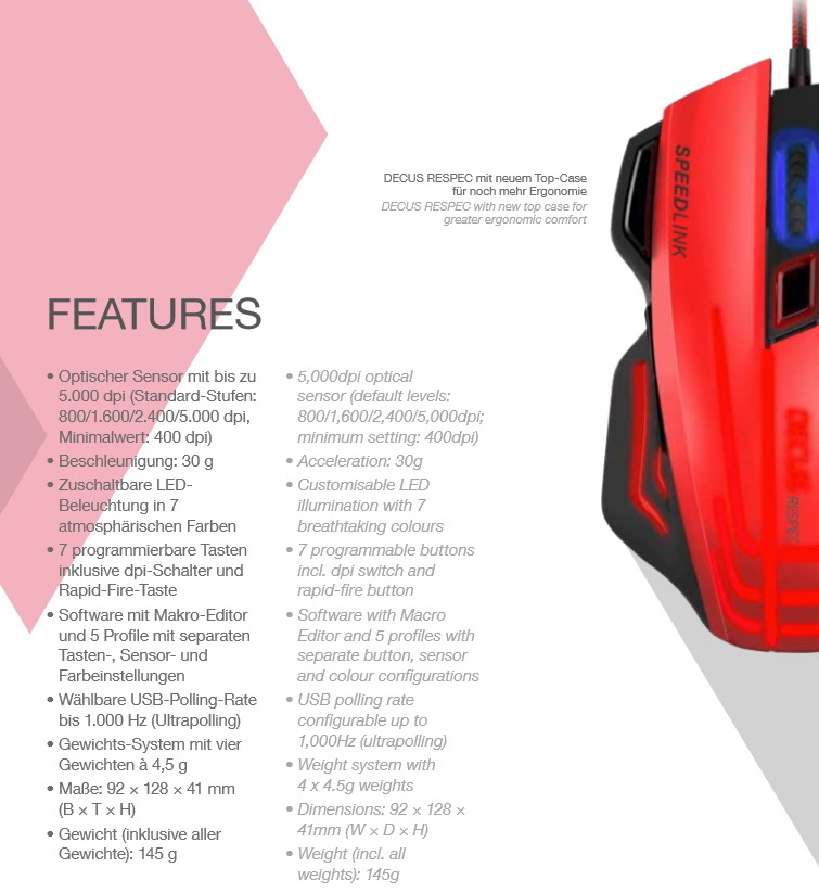 Speedlink spendiert seiner bewährten Gaming-Maus Decus ein Facelift mit neuen Features und optimierten Details. Die ursprüngliche ergonomische Form des Vorgängermodells wurde für die neue Decus Respec Gaming-Mouse übernommen. Lediglich das Top-Case der Maus wurde neu entwickelt und ebenfalls einem Redesign unterzogen.